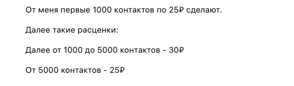 - Стоимость контакта от ~25—35 ₽, часто с бонусами при пополнении баланса