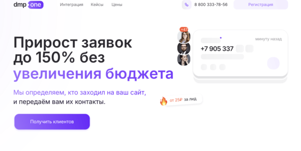 2. DMP.ONE — система идентифицирует до 30% информации для связи с клиентами вашего сайта, представляющими интерес для бизнеса. При этом цена одного такого потенциального клиента начинается от 25 рублей. Наличие собственного колл-центра позволяет осуществлять обзвон «холодных» контактов, передавая вам только заинтересованных в сотрудничестве клиентов. В качестве бонуса при регистрации вы получаете 40 бесплатных лидов для ознакомления с сервисом.