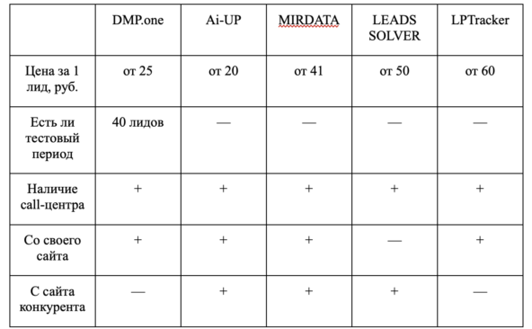 Сравним основные возможности представленных сервисов в таблице: Если у вас крупные бюджеты на покупку и обработку заявок — мы предоставляем уникальные цены на сбор контактов конкурентов и обработку колл центром. От 20.000р даем стоимость в 15р за сбор контактов и 25р за обработку колл центром. Пишите в личные сообщения — @scripptt Рейтинг среди пользователей: 4.9⭐ Ссылка на сервис: ai-up.ru Ai-UP — сервис перехвата лидов конкурентов Интеграция с другими платформами: amoCRM, Make, Битрикс24, Leod2Call Дополнительные возможности: интегрированная CRM-система с понятным интерфейсом и удобными адаптируемыми настройками этапов сделок, полное сопровождение. Сервис делает основной акцент на идентификации клиентов, которые звонят с сайтов-конкурентов. Горячие лиды по конкурентоспособной цене позволяют уменьшить затраты на контекст и таргет. Функционирование сервиса базируется на размещении пикселя на веб-сайте, мониторинге трафика из заданных источников и применении CRM для систематизации входящих запросов. В корпоративных аккаунтах соцсетей регулярно публикуются аналитические данные и примеры успешного увеличения числа обращений. Благодаря автоматизированному процессу сбора информации и быстрой техподдержке, платформа является действенным решением для предприятий малого и среднего бизнеса. Ключевые характеристики: Рейтинг среди пользователей: 5.0⭐ Ссылка на сервис: dmp.one dmp.oneDMP.one | Сервис идентификации и определения данных посетителей сайта Интеграция с другими платформами: Битрикс24, Telegram, amoCRM Дополнительные возможности: интегрированная CRM-система, эффективные скрипты Данная платформа представляет собой исключительное решение для распознавания пользователей. Помимо простого сбора контактной информации она выявляет подлинные сведения, такие как номер телефона, электронную почту и предпочтения. Интеграция с CRM-системами и рекламными платформами позволяет намного быстрее получить лиды конкурентов. Важно подчеркнуть, что платформа функционирует без использования личных данных, обеспечивая тем самым полное соответствие требованиям законодательства. Настройка занимает всего несколько минут, а ощутимый прогресс станет заметен даже при минимальном количестве трафика. Особенности: Рейтинг среди пользователей: 4.8⭐ Ссылка на сервис: mirdata.ru mirdata.ruBIG Data от MIRDATA — Клиенты Ваших конкурентов Ваши | МИРДАТА Интеграция с другими платформами: AmoCRM, Telegram, Битрикс24, Google Sheets Дополнительные возможности: частичная идентификация «горячих» клиентов, изменение скриптов под определенное бизнес-направление. Инструмент подходит для автоматического определения контактов посетителей, а также лидов, которые ушли к конкурентам, не оставив заявку. Это решение особенно ценно для малых и средних предприятий, поскольку позволяет генерировать качественные лиды, не увеличивая расходы на продвижение. Работа платформы основана на изучении цифровых следов пользователей и их сопоставлении с данными операторов связи. Такой подход позволяет выявить до 30% телефонных номеров посетителей сайта. Полученные контакты автоматически передаются в CRM-системы (например, Битрикс24 или AmoCRM), что упрощает процесс обзвона потенциальных клиентов и организации email-рассылок. Основные преимущества: Сервисом уже пользуются свыше 23 000 организаций. Компания обладает значительным опытом рабо