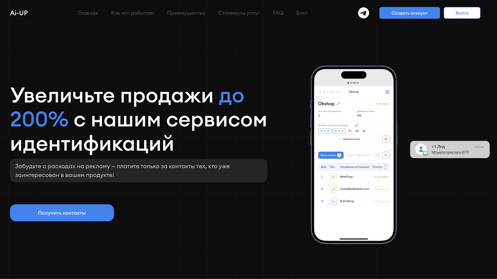 Ai-UP — это платформа лидогенерации, ориентированная на точную идентификацию посетителей и звонящих с сайтов конкурентов. Такой подход помогает сократить расходы на контекстную и таргетированную рекламу, предлагая «горячие» лиды по доступной цене. Работа сервиса строится на установке пикселя и отслеживании активности на целевых ресурсах, а встроенная CRM-система позволяет оперативно обрабатывать заявки.