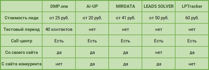 Стоимость: от 65 000 руб. за тариф Тестовый период: отсутствует Интеграция с платформами: Битрикс24, amoCRM, Google Sheets, Telegram, Leod2Coll, Make Дополнительно: специальные условия для новых клиентов, юридическая гарантия конверсии при работе через колл-центр, настройка дополнительных критериев сегментации и замена некачественных лидов.