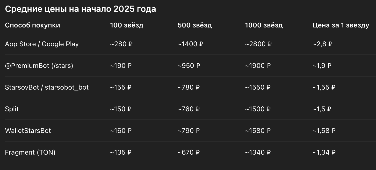 Некоторые каналы уже тестируют модели подписки за звёзды Телеграм. Подписчик оплачивает доступ к контенту ежемесячно в Stars, а автор получает регулярный доход. Такой формат удобен тем, что не требует сторонних платёжных сервисов — всё работает прямо в приложении. Чтобы не тратить время на сомнительные боты, мы собрали проверенные сервисы, через которые можно быстро пополнить баланс Stars и купить NFT-подарки. Список идёт в правильном порядке, к каждому сервису прилагаем рабочую ссылку и скриншот интерфейса. Один из самых популярных ботов для покупки звёзд Телеграм. Через него можно пополнить баланс буквально за пару минут. Поддерживаются карты российских банков и СБП, что делает покупку удобной для аудитории из РФ. Внутри бота можно выбрать нужный пакет и оплатить в несколько кликов. Многие отмечают, что именно здесь один из самых выгодных курсов. Ссылка на сервис — StarsovBot Этот бот выполняет те же задачи, но отличается интерфейсом и наличием дополнительных опций. Пользователи отмечают стабильную работу и отсутствие «подвисаний» при оплате. Для тех, кто регулярно покупает звёзды Телеграм, starsobot_bot может стать хорошей альтернативой PremiumBot: курс ниже, а способов оплаты больше. Ссылка на сервис — starsobot_bot Split — это не просто бот, а полноценный сервис для покупки и обмена звёзд Телеграм. Его особенность в том, что можно разделять купленные звёзды и передавать их сразу нескольким пользователям. Часто курс здесь выгоднее, чем у ботов, а функциональность шире: есть поддержка кросс-оплаты и дополнительных опций для админов каналов. Ссылка на сервис — Split Этот бот удобен тем, что связывает покупку звёзд Телеграм напрямую с Telegram Wallet. Вы можете не только пополнять баланс, но и сразу управлять средствами через кошелёк TON. Такой вариант идеально подходит тем, кто планирует не просто покупать звёзды для подарков, но и выводить их через Fragment. Ссылка на сервис — WalletStarsBot Звёзды Телеграм открывают авторам и владельцам каналов целый набор способов заработка. Теперь монетизация не требует сторонних сервисов или платёжных систем: всё встроено в экосистему мессенджера. Для админов это удобный инструмент, который позволяет превращать активность подписчиков в реальный доход. Администратор может сделать часть реакций платными. Пользователь оплачивает их звёздами Телеграм и оставляет под постом. Для читателя это возможность выделиться или показать особое отношение к контенту, а для канала — дополнительный источник дохода. Чем активнее аудитория, тем выше прибыль. Канал можно перевести на модель подписки, где доступ к материалам открывается только тем, кто оплачивает его звёздами Телеграм. Это создаёт стабильный денежный поток для админа и делает доход предсказуемым. Удобно то, что пользователям не нужно вводить данные карты — всё работает в два клика. Создатель канала может отметить пост как платный. Такой контент смогут видеть только те подписчики, которые оплатили доступ. Для админа это отличный способ предлагать эксклюзив — например, аналитику, инсайты или авторские материалы. Таким образом, звёзды Телеграм превращаются в инструмент премиум-доступа. Telegram развивает партнёрские механики, где авторам начисляют часть дохода в звёздах. Чем больше вовлечённость и трафик, тем больше начисления. Это мотивирует авторов создавать качественный контент 