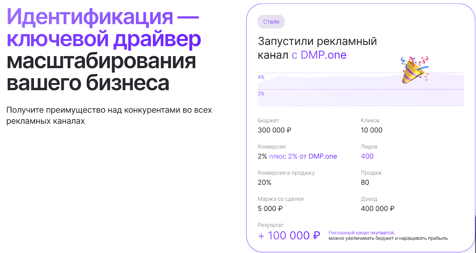 - Минимальная стоимость лида. Цена идентификации начинается от 25 ₽, что в разы дешевле контекстной рекламы.