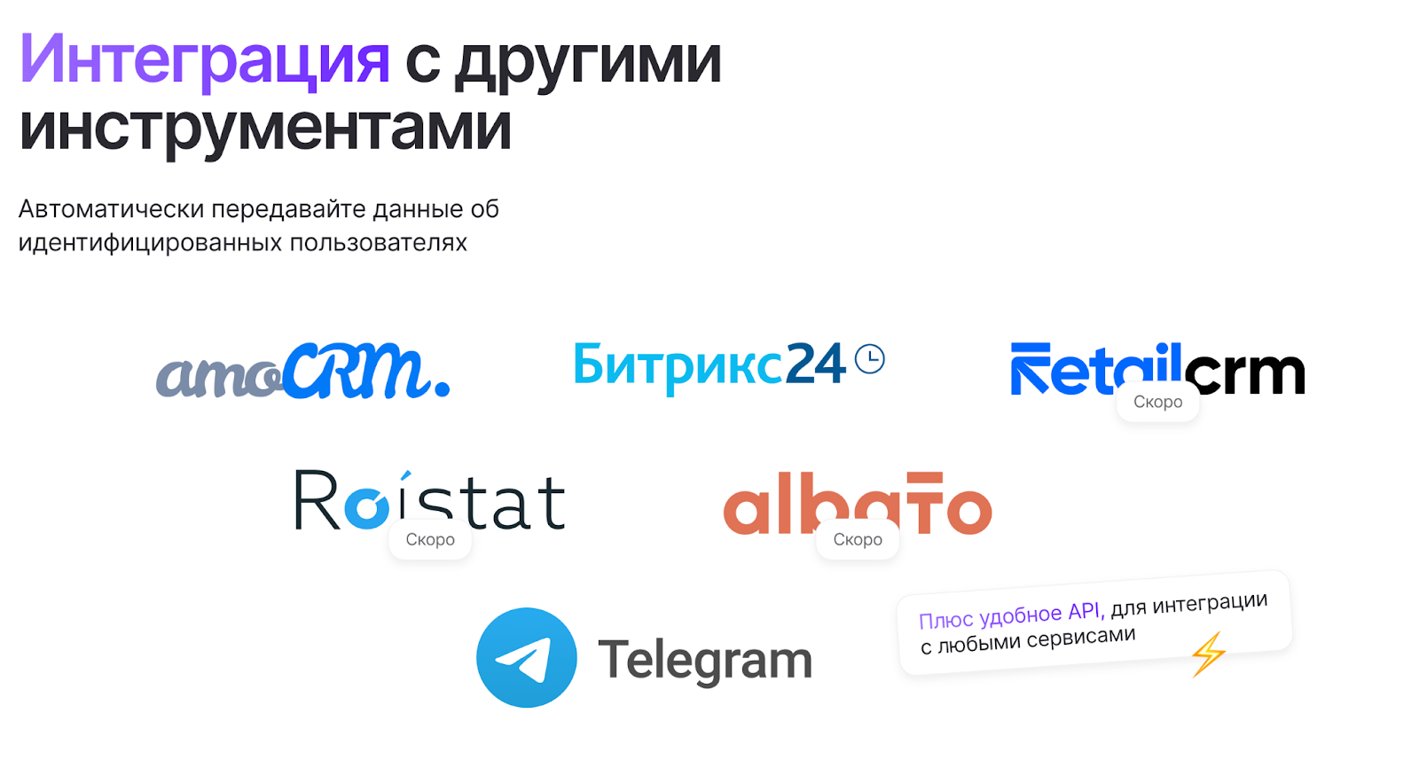 - Простая интеграция с популярными CRM и рекламными системами.