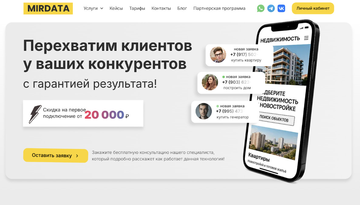 5. Перехват лидов у конкурентов Метод, который в последние годы набирает популярность. Суть проста: человек уже ищет ваш товар или услугу у конкурентов, и вы получаете его контакт в тот же момент. Это законный способ работать с заявками, потому что данные берутся из открытых форм и каталогов. Перехват особенно эффективен в конкурентных нишах: недвижимость, образование, услуги для бизнеса. Вместо холодных звонков вы работаете с людьми, которые прямо сейчас заинтересованы в продукте.