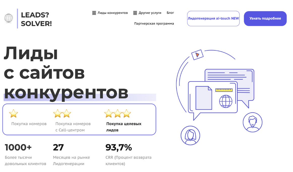- Leads-solver Автоматизирует сбор и верификацию клиентских данных. Экономит время отдела продаж и позволяет быстро запустить рекламные активности.