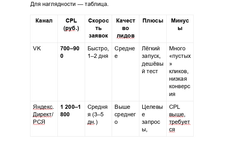 В Крыму один и тот же канал ведет себя по-разному: где-то заявки дешевле, но «холоднее», где-то дороже, зато ближе к сделке. Ниже кратко разберем VK, Директ/РСЯ, Авито, ЦИАН и покупку готовых лидов, чтобы дальше честно сравнить их по CPL и качеству.