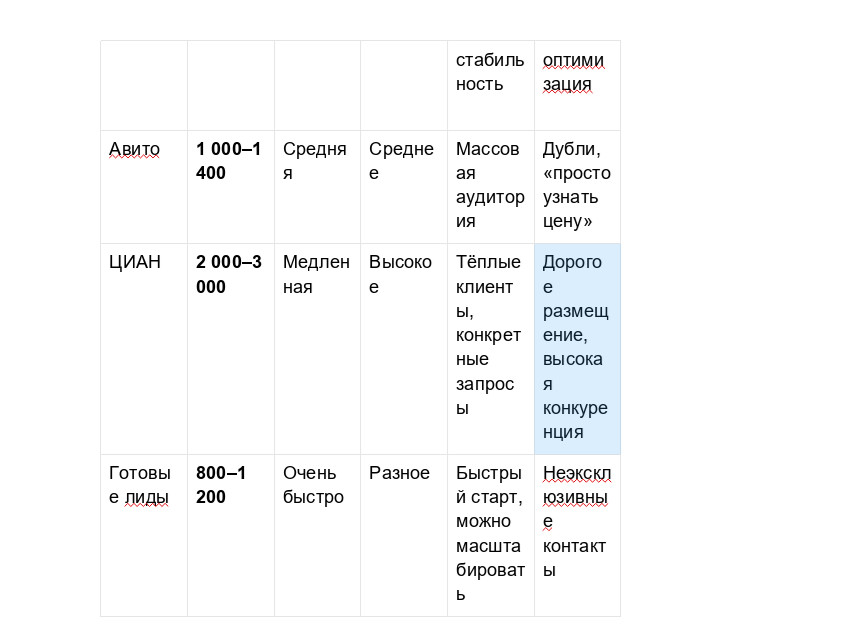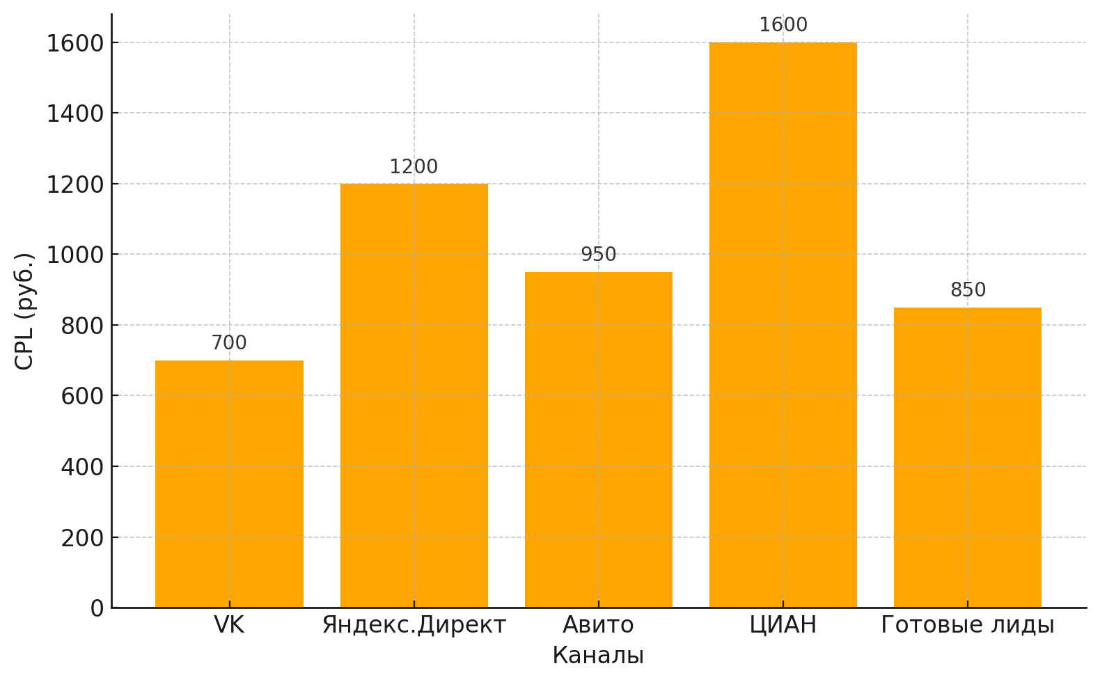 Минус — лиды неэксклюзивные: человек мог оставить заявку в нескольких компаниях.Поэтому решают скорость реакции и правильный скрипт продаж. В Крыму именно готовые лиды помогают запустить первые продажи за 1–2 дня, пока реклама еще проходит этап тестов. Схема воронки продаж: канал, лид, звонок, показ, сделка, Крым 2025 Когда сравнили источники заявок, увидели: стоимость 1 лида в Крыму сильно отличается.В одних каналах CPL ниже, но качество хромает. В других цена выше, зато лиды доводят до сделки. CPL каналов недвижимости Крым 2025, наглядное сравнение стоимости заявок Стоимость заявки сама по себе мало что значит, если лиды не доводят до сделки.Перед масштабированием бюджета оцените качество — простой чек-лист: Даже хороший канал не даст результат, если реклама настроена неправильно.Пять типичных ошибок: Ни один источник не универсален.Для быстрого старта — готовые лиды, чтобы в тот же день получить звонки и проверить скрипты.Для роста — добавить стабильный канал (Яндекс.Директ или ЦИАН), чтобы масштабировать поток с прогнозируемым CPL. Такая комбинация снижает риски, помогает управлять стоимостью 1 лида и держать сделки даже при колебаниях в отдельных источниках. ➡️ Мы можем рассчитать медиаплан под ваш объект — запросите его здесь В 2025 году рынок недвижимости Крыма остается конкурентным, и разница в стоимости лида в Крыму между каналами — кратная.VK дает быстрые и дешевые заявки, но качество часто страдает.Директ и РСЯ дороже, зато стабильнее. Авито и ЦИАН приносят «теплых» клиентов, но требуют серьезных вложений.Готовые лиды на недвижимость позволяют выйти на звонки уже сегодня и протестировать спрос без длительных запусков. Лучшее решение — не ставить на один источник, а комбинировать: быстрый старт на готовых заявках плюс один-два канала для масштабирования. Так вы держите под контролем цену за лид, снижаете риски и быстрее выходите на сделки.Хотите медиаплан под ваш объект с расчётом CPL? Запросите его прямо сейчас — @scripptt.