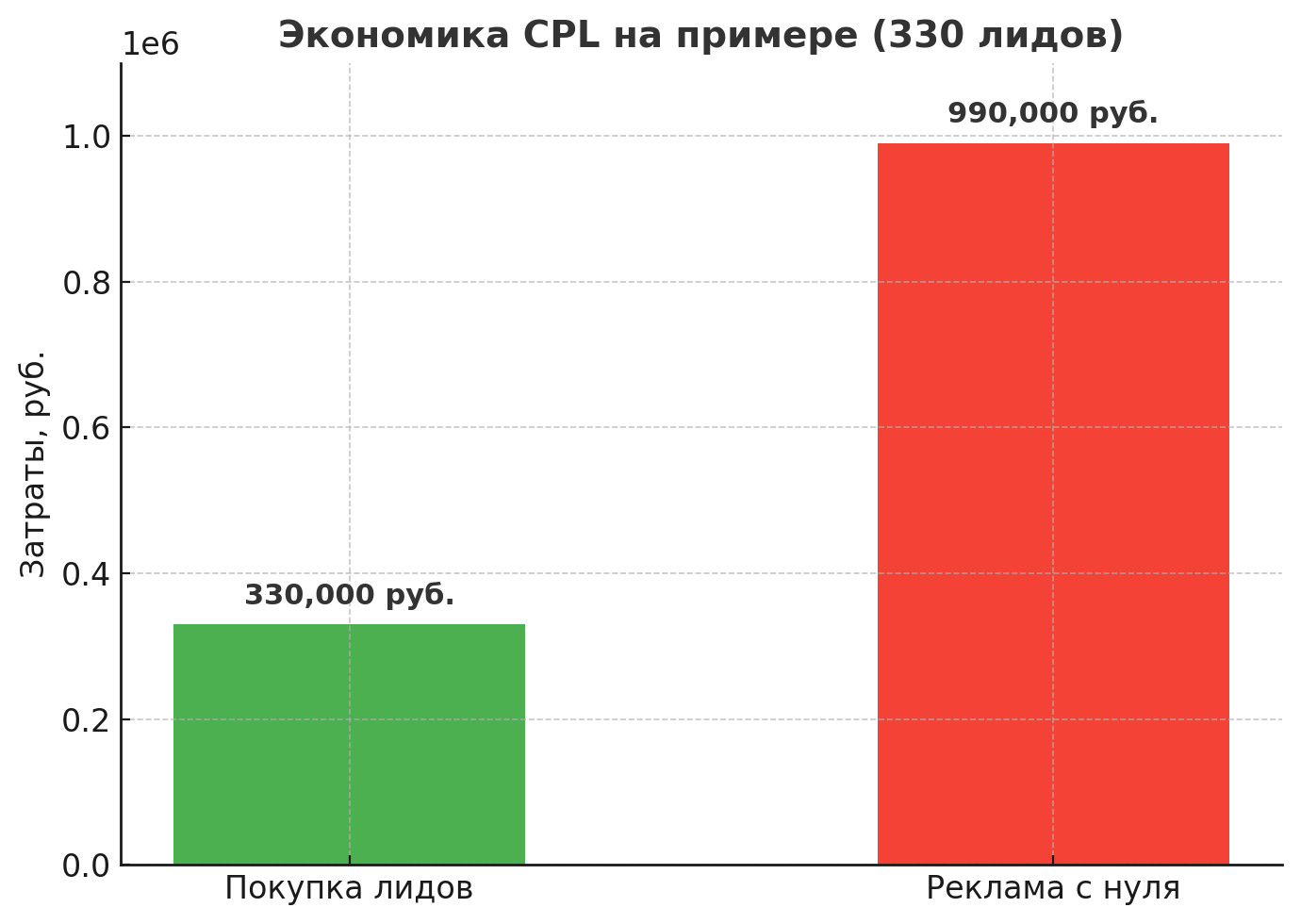 На подготовку уходит 2–8 недель. Все это время сгорает тестовый бюджет, а стоимость лидов остается непредсказуемой. Именно поэтому запуск с нуля несет больше рисков, чем работа с готовыми заявкам Разница — 660 000 ₽ в пользу готовых заявок. Столбчатая диаграмма «Экономика CPL на примере» Оптимальная стратегия: не противопоставлять, а комбинировать. Мы сравнили два подхода и получили выводы: Узнайте, сколько заявок можно получать уже завтра, и сравните CPL с вашим медиапланом — @scripptt.