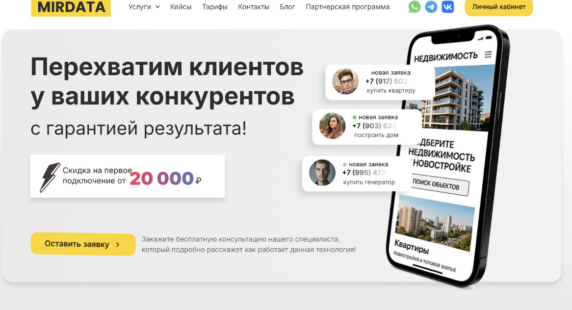 - Быстрый рост клиентской базы. Перехват даёт готовые заявки в первые дни запуска.