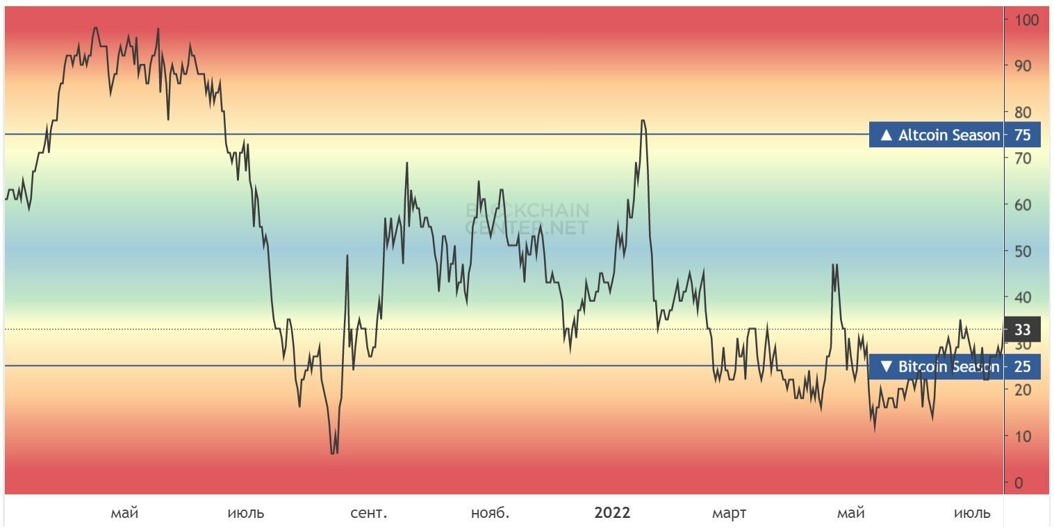График взят с сайта blockchaincenter, перейдя по ссылке можно отслеживать индекс альтсезона.