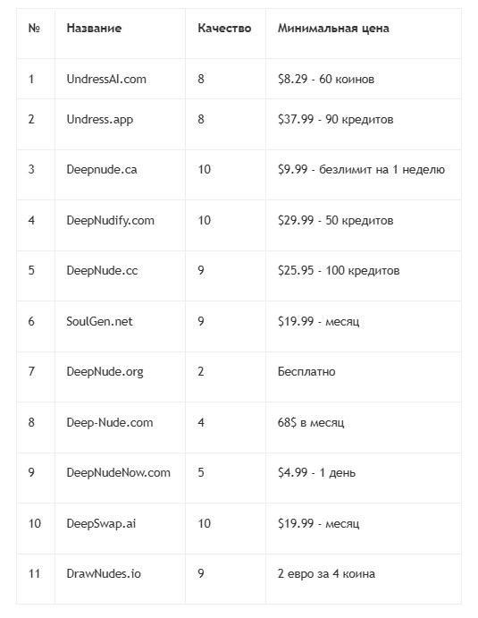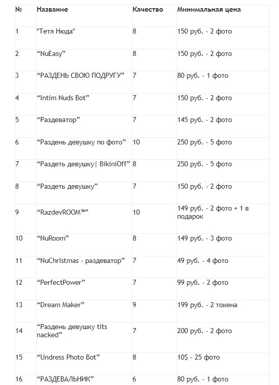 Все сервисы с таким функционалом можно разделить на виды: боты на раздевание и специальные сайты. Я проверил свыше 50 сервисов и определил 30 лучших сервисов по качеству обработки, цене, скорости исполнения и удобства оплаты. Далее я расскажу о каждом из них подробнее.