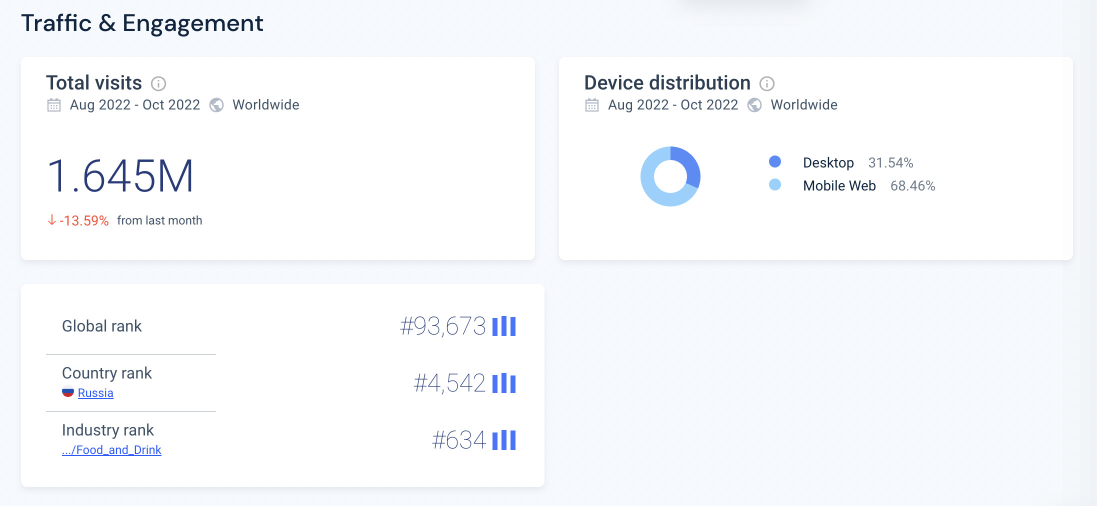 Видим, что сайт Азбуки Вкуса с августа по октябрь посетило около 1,64 млн человек. Сразу скажу, что нельзя брать эту и все остальные цифры за чистую монету. Similar web, как и другие сайты для анализа конкурентов используют специальный алгоритм для сбора данных, а не напрямую берет информацию у ваших конкурентов, поэтому могут быть погрешности в данных.