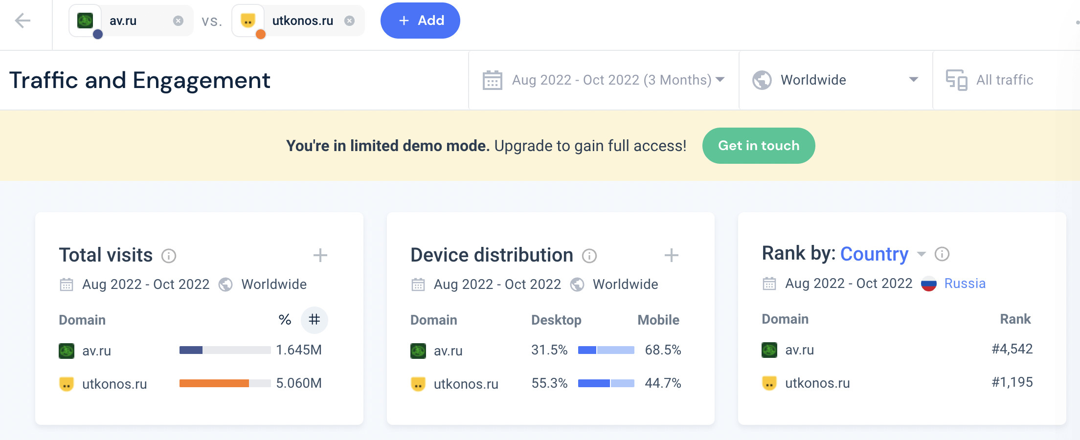 Так, например, было бы, если бы мы добавили к сравнению конкурента — сайт Утконос. И уже в сравнении с Утконосом мы бы сделали некоторые выводы.