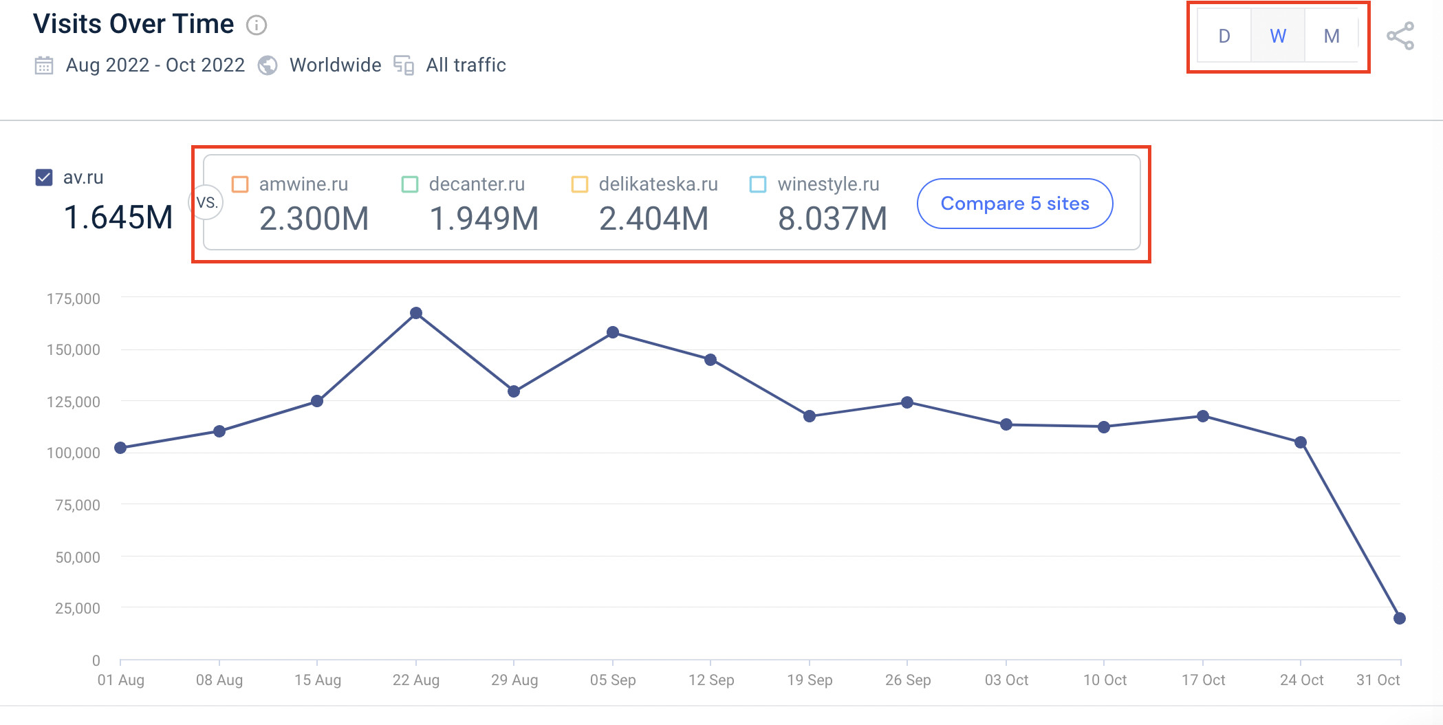 Также Similar Web сразу предлагает добавить конкурентов (которых он вычисляет сам). Что-то сомневаюсь, что это реальные конкуренты Азбуки Вкуса, кажется, что Similar Web ошибается. Но все можно проверить, если зайти на каждый из этих сайтов.