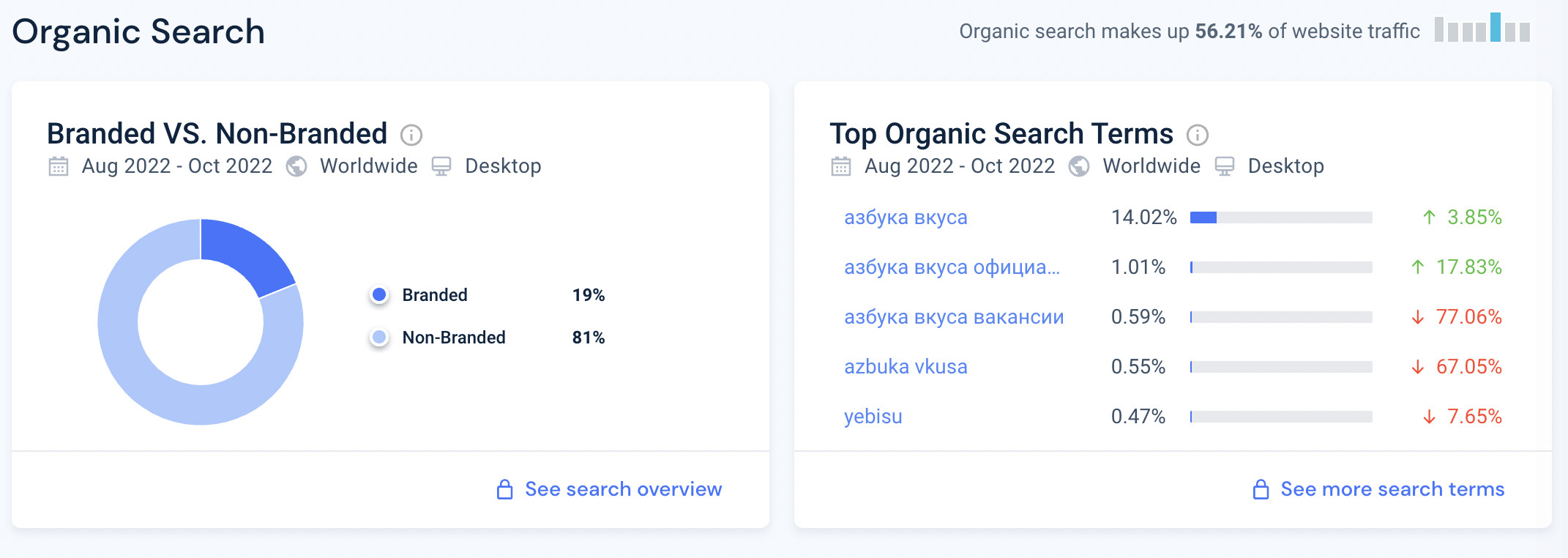 В основном (81%) органический трафик не брендовый. Брендовыйтрафик — это трафик по поисковым запросам, связанным с брендом, например по запросу «Азбука Вкуса»). Соответственно не брендовыйтрафик — это любые другие запросы, по которым находят Азбуку Вкуса.