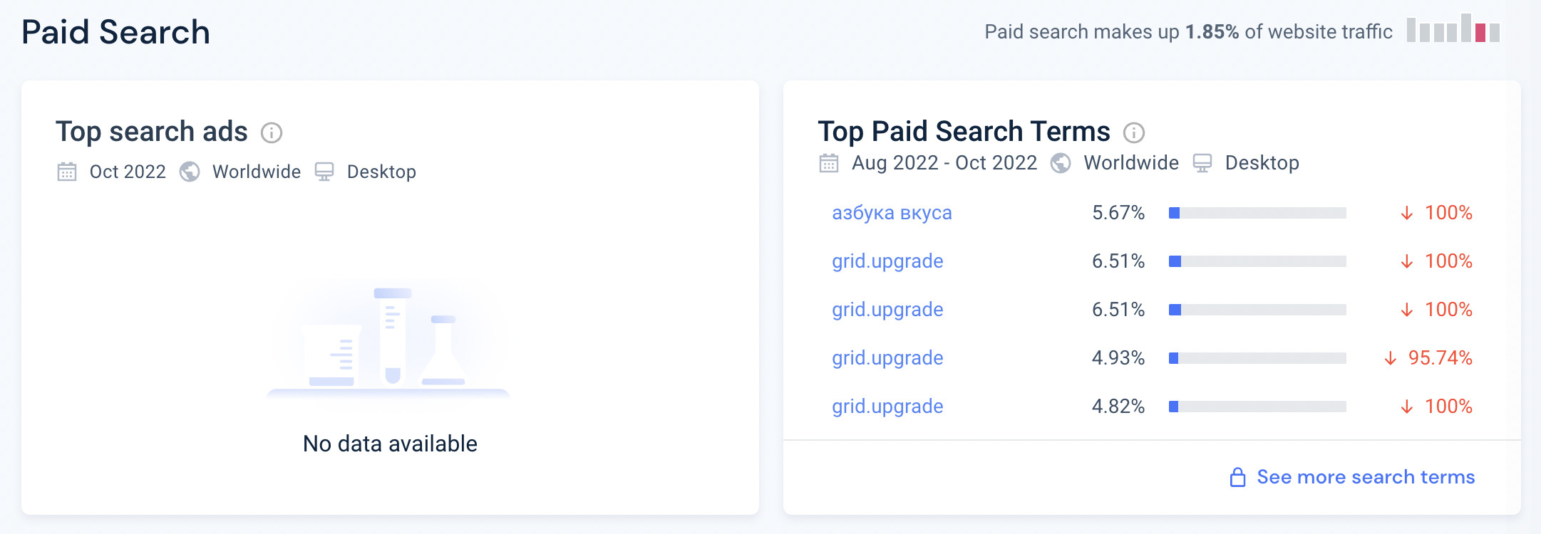 По поисковым объявлениям мы данных не видим, возможно их просто нет, так как в данном разделе данные только за октябрь. А если посмотреть раздел платных поисковых запросов — то видим большое падение. Можем сделать вывод, что Азбука Вкуса скорее всего не размещала платную рекламу в октябре, но точно размещала в августе или сентябре.