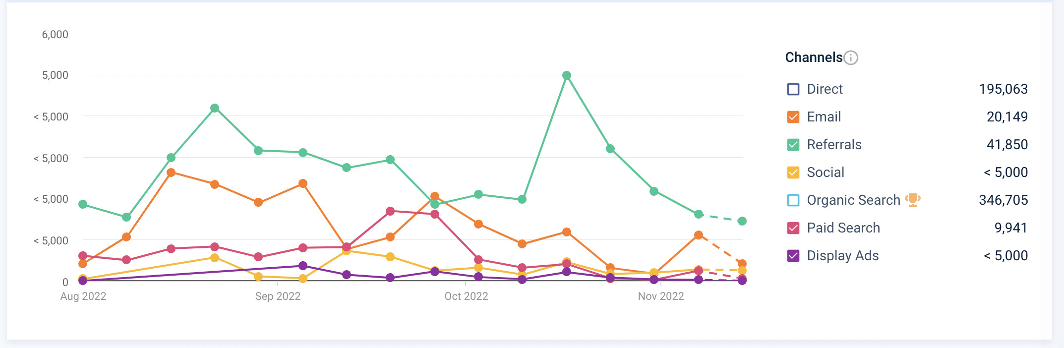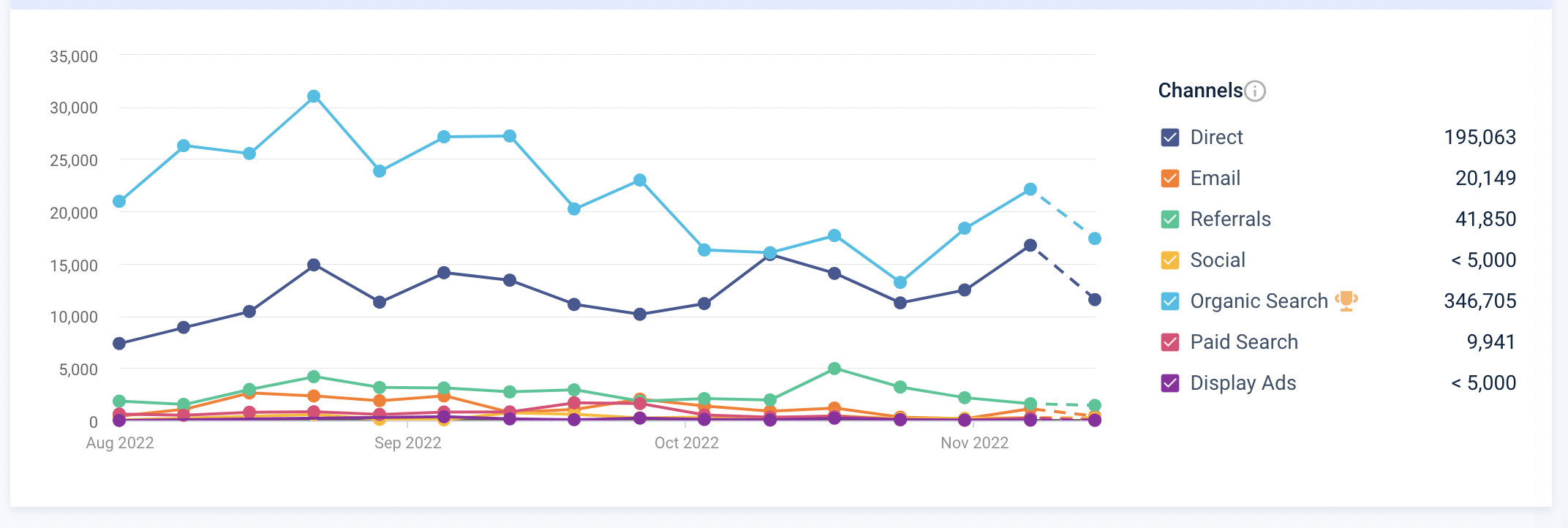 На данном графике видно тенденции — по каким каналам посещаемость снижается, по каким растет. Органический трафик, например, имеет тенденцию к снижению, а вот прямой трафик растет.