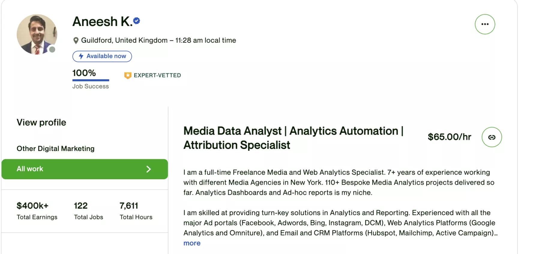 Неплохо, правда? Но тут конечно есть нюанс, что большинство из работ (за исключением нескольких) — с почасовой оплатой. Всего получается 3119 часов за 2022 год. Если разделить на 8 часовой рабочий день, то это почти 390 дней (при том что в году 365). Вряд ли он мог работать без выходных и более 8 часов в день, поэтому скорее всего, он привлекал других фрилансеров к работе, то есть (частично или полностью) выступал в роли агентства. В любом случае (делал ли он сам или выступал в роли агентства) — я вижу, что можно заработать на Upwork неплохие деньги. И 65 долларов в час — это еще не предел. Вот например, Joshua B. зарабатывает 150 долларов в час, правда у него немного другая специфика работы. И есть и другие подобные примеры аккаунтов, которые зарабатывают на Upwork достаточно хорошо. Но есть ряд вопросов, которые остаются открытыми: Иными словами, можно ли повторить успех лучших исполнителей с Upwork? P.S. Я считала за год, но некоторые проекты длятся с 2021 года. Для таких проектов путем нехитрых подсчетов я вычислила суммы и часы только за 2022 год. Понятно, что в таком случае цифры могут быть не точными, тк мы не знаем реально, сколько в какой год работал. Но таких проектов всего несколько и по сумме они не значительны, поэтому особо на итоговые суммы, думаю, это не повлияло. Читайте интересные посты в моем телеграм канале по аналитике Аналитика и Growth mind-set: А также на канале делюсь личными кейсами, а также историей поиска работы зарубежом! Также у меня есть личный канал Маруся in the world.
