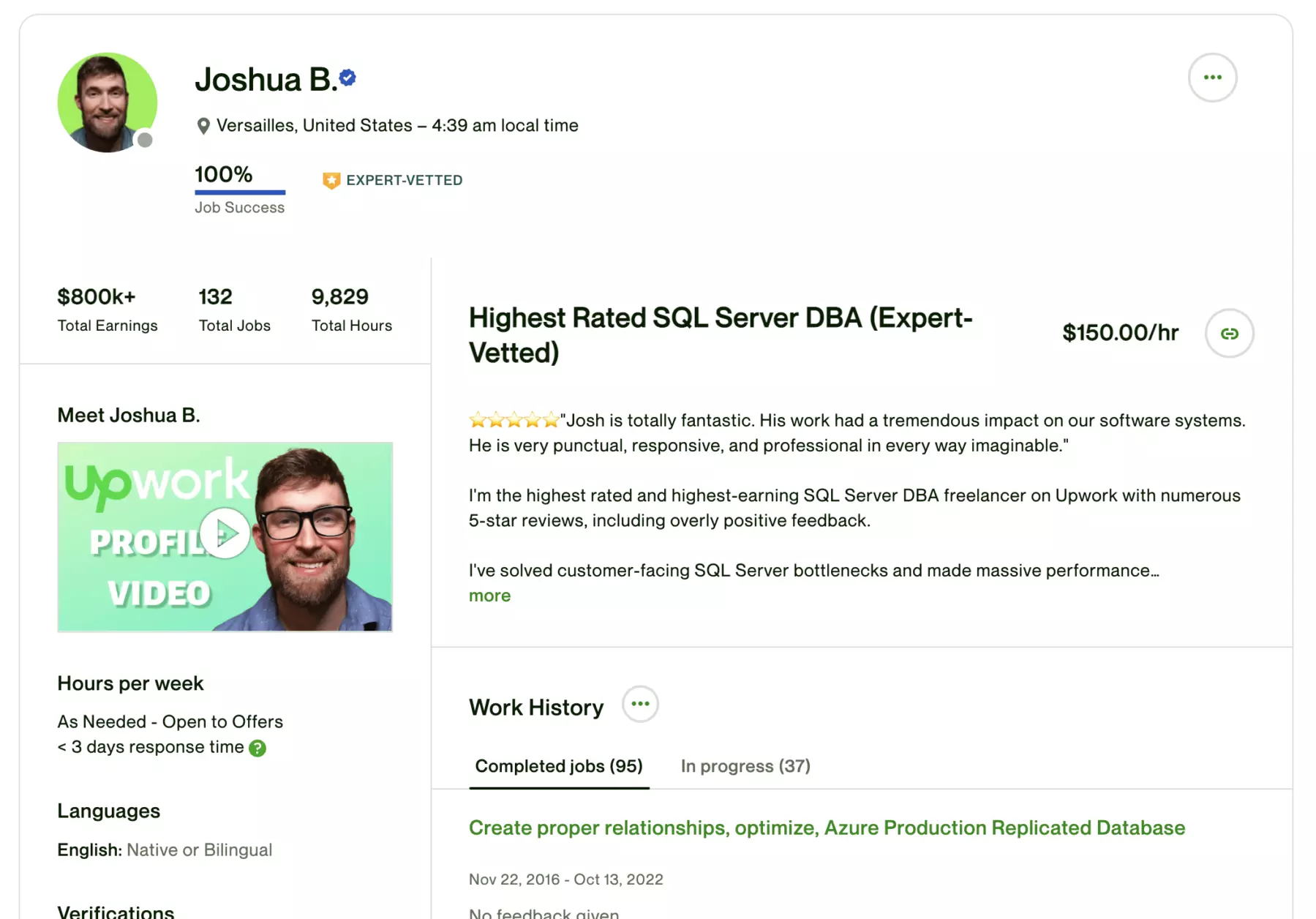 Первую работу начал 29 февраля 2020 года, то есть работает чуть меньше 3 лет. В общей сложности он выполнил 122 работы на сумму $400k+.