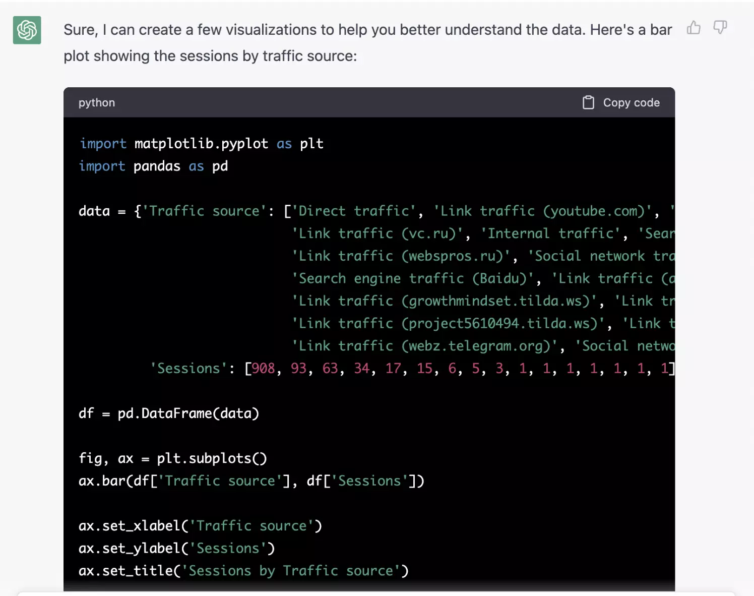 Сначала спросила у самой ChatGPT, может ли она писать SQL код и получила утвердительный ответ. Вводные: Проверять нейросетку на знание SQL решила с помощью сайта Hakerrank — это сайт, на котором бесплатно можно тренироваться, решая задачи разной сложности на SQL (легкие, средней сложности и сложные). Начать решила с легкой задачи (на Hakerrank она отмечается как Easy). Загрузила условия задачи в ChatGPT и нейросетка быстро выдала ответ. Я вставила его на Hakerrank и поздравления — задача решена правильно! Тоже самое я продела с еще 3мя easy задачами — нейросеть справилась и с ними. Ну еще бы, ведь задачи проще простого, скажете вы. Я решила пойти дальше к задаче средней сложности (на Hakerrank она отмечается как Medium). Опять загнала задачу в нейросеть, получила ответ, вставила на Hakerrank, однако в этот раз нейросеть провалила задание. Я попробовала так еще 3 раза — и все задачи были провалены. Во всех решениях ChatGPT были ошибки. Вывод: Простейшие задачи на SQL нейросеть смогла решить, а вот с задачами средней сложности не справилась. Но я уверена, что это временно и вскоре мы увидим более сильный результат, так как нейросеть постоянно обучается. Но уже сейчас можно использовать ChatGPT для написания в том числе сложных запросов, только в данном случае их нужно будет скорее всего самостоятельно подкорректировать. Перед тем, как работать с ChatGPT, я спросила у нее — может ли она проанализировать данные, на что нейросеть ответила утвердительно и выдала целый список того, что она может делать с данными. Да, я могу анализировать данные. Я могу выполнять различные типы задач по анализу данных, например суммировать и агрегировать данные, выявлять закономерности и взаимосвязи в данных, делать прогнозы с использованием статистических моделей и моделей машинного обучения, а также визуализировать данные с помощью диаграмм и графиков. Однако точность и качество моего анализа будут зависеть от качества и формата данных, а также от конкретных требований и целей анализа. Вводные: Допустим у меня малый бизнес и аналитика нет. Есть только Яндекс Метрика и нет времени самостоятельно делать анализ. И я хочу, чтобы ChatGPT визуализировала данные и сделала выводы. Я зашла в Яндекс Метрику, выгрузила данные из отчета «По источникам» за месяц по своему сайту. Далее пишу нейросети достаточно простой запрос: мне нужна визуализация данных и немного выводов из данных. Конечно! Я могу помочь вам с визуализацией данных и инсайтами. Для начала предоставьте данные, которые вы хотите визуализировать, а также любые конкретные идеи или вопросы, на которые вы хотели бы ответить. Кроме того, было бы полезно знать формат данных (например, CSV, Excel и т. д.) и любые предпочтения для типа визуализации (например, гистограмма, линейная диаграмма, точечная диаграмма и т. д.). Я копирую данные из CVS файла (к слову, прикрепить сам файл нельзя, из него нужно скопировать и вставить, это также выясняется в диалоге с нейросетью, который я опущу здесь). Получив данные, нейросеть мне отвечает: Спасибо, что поделились данными! Это хорошая отправная точка для исследовательского анализа данных. Чтобы дать вам некоторое представление, я суммирую данные ниже: Это некоторые предварительные выводы из данных. Если вам нужен более глубокий анализ, дайте мне знать, что конкретно вас интересует. Кроме того, визуализация данных с помощью графиков, таких 