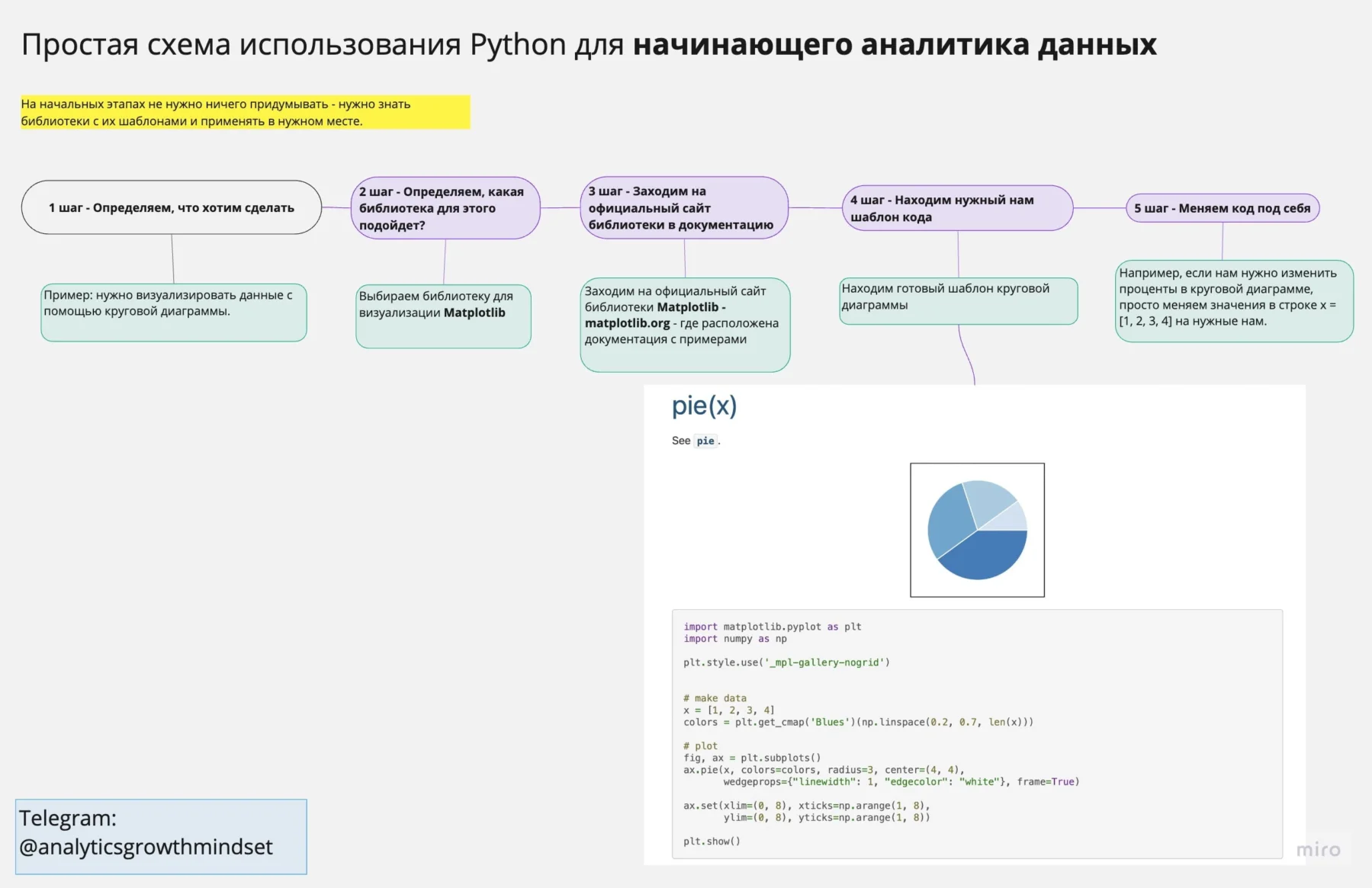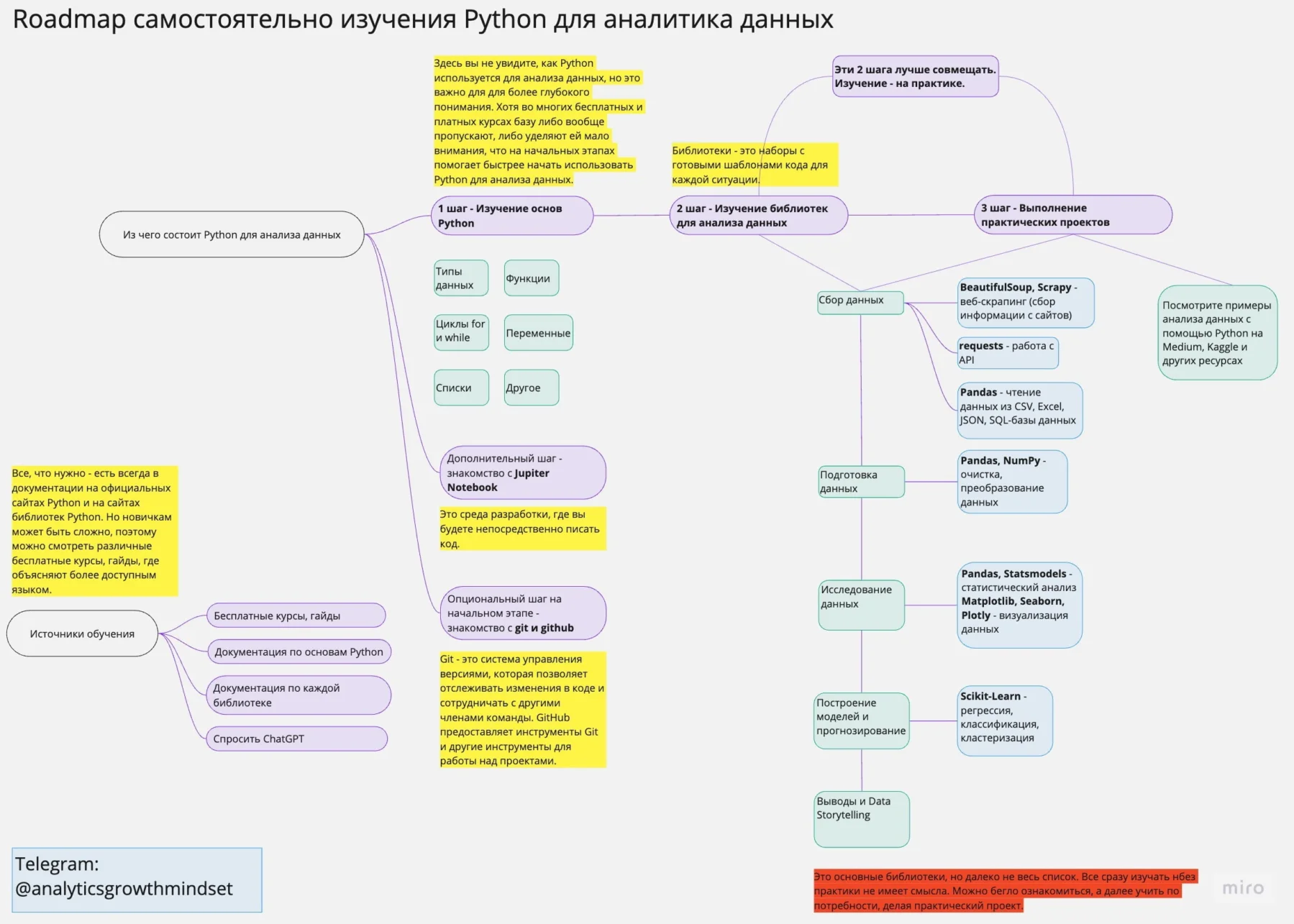 Нарисовала 2 схемы, которые помогут вам, если вы начинающий аналитик данных и решили самостоятельно изучать Python.
