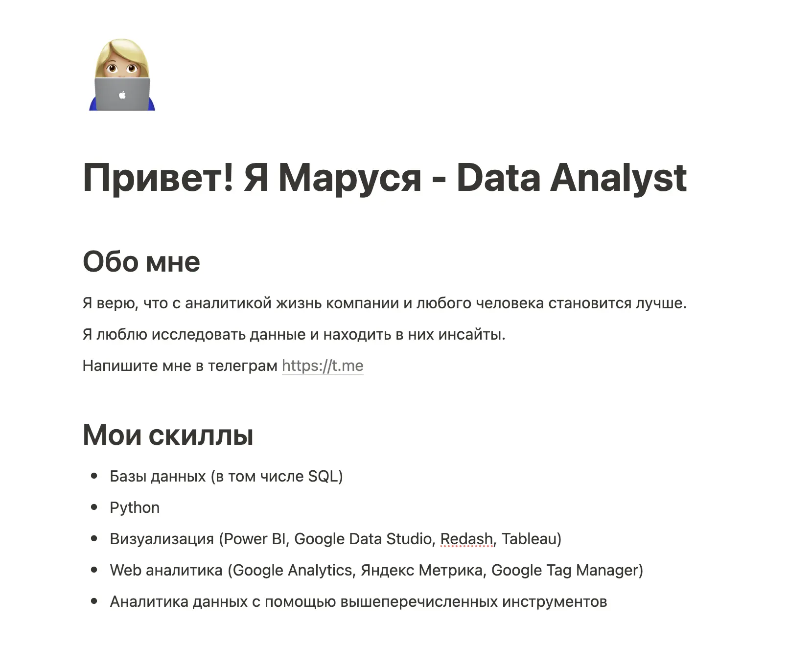 Вначале я сделала краткое описание своей «миссии» и свои скиллы — что я умею. Далее я описывала отдельно каждую услугу, которую я готова предоставить в формате: Нюанс — всех клиентов в портфолио я называла «по имени», так как информация не была конфиденциальной и конкретному отдельному человеку я могла ее рассказать, но тут на всякий случай имя клиента скрываю. Мои клиенты были с предыдущих мест работы по найму. Если вы еще нигде не работали — тогда пишите учебные проекты. Аналогичным образом расписала и для других услуг, которые я хотела оказывать — Аудит систем Web аналитики, Визуализация | Построение дашбордов, Аналитика данных | Нахождение инсайтов в данных. В конце указала стоимость, условия сотрудничества и контакты. Примеры портфолио других аналитиков данных приводила тут. Как писала выше, «маркетинг» или «самопродвижение» являются важной частью. Нужен четкий план, как получить клиентов и настроить «поток» клиентов. Где я разместила свое портфолио? В итоге я получила 16 заказов: Я считаю важным размещать портфолио на как можно большем количестве площадок. В общей сложности я разместила свое портфолио на более чем 30 площадках (РФ и зарубежных). Здесь не буду перечислять все (это тема для отдельной статьи). Множество площадок можно найти простым поиском в google, причем в англоязычном пространстве вы можете найти рекомендации по площадкам в конкретной сфере — аналитике данных, маркетинге, дизайне, программировании и пр. Также на некоторых площадках есть биржи с заданиями, где можно откликаться на понравившееся задание. Я делала это регулярно при появлении новых заданий. Практически все полученные заказы были связаны с построением дашбордов. Как писала выше, все поступившие заказы были связаны с дашбордами. На втором месте на рынке РФ, на мой взгляд, задачи по настройке систем веб-аналитики (судя по размещенным задачам на биржах). На зарубежном рынке на биржах можно найти задачи на любой вкус — от простых задач по настройке систем веб аналитики до задач, связанных с машинным обучением. Сделала эту статью, так как был на нее запрос в моем телеграм канале по аналитике. Для себя же я поняла, что фриланс — это не то, чем я хочу заниматься и выбрала реализацию собственных бизнес-проектов (некоторые из них связаны с аналитикой данных). Подписывайтесь на мой телеграм канал Аналитика и growth mind-set — помогаю начинающим (и не только) расти в аналитике данных.