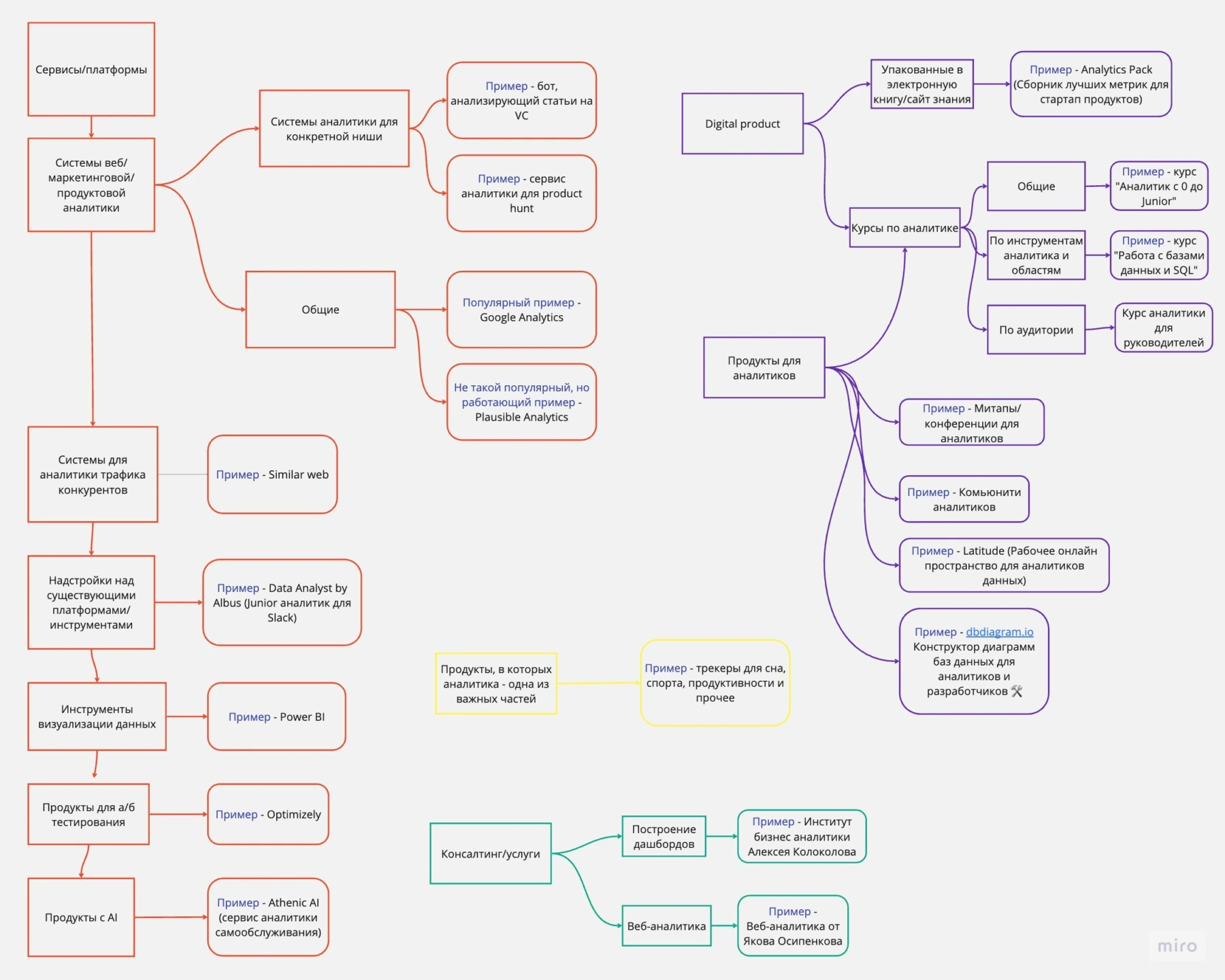 Сделала схему, на которой отобразила направления, в которых можно делать продукты, связанные с аналитикой данных с примерами. Это просто примеры, которые возможно сподвигнут вас создать что-то свое. Также рекомендую читать Product Hunt и IndieHakers (я периодически их просматриваю) — там тоже можно найти примеры.