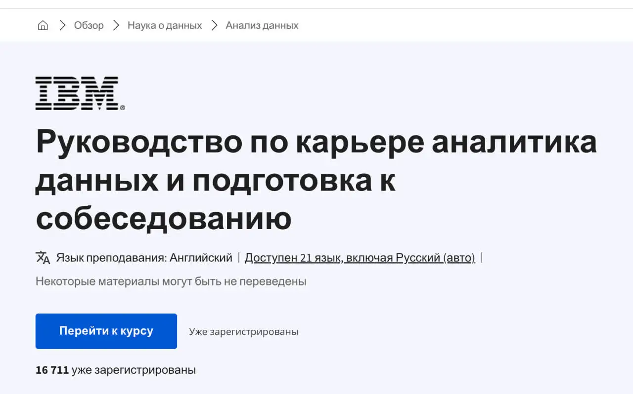 Руководство по карьере аналитика данных и подготовка к собеседованию от IBM* — небольшой курс всего на 10 часов, который готовит начинающих аналитиков данных к выходу на рынок труда.