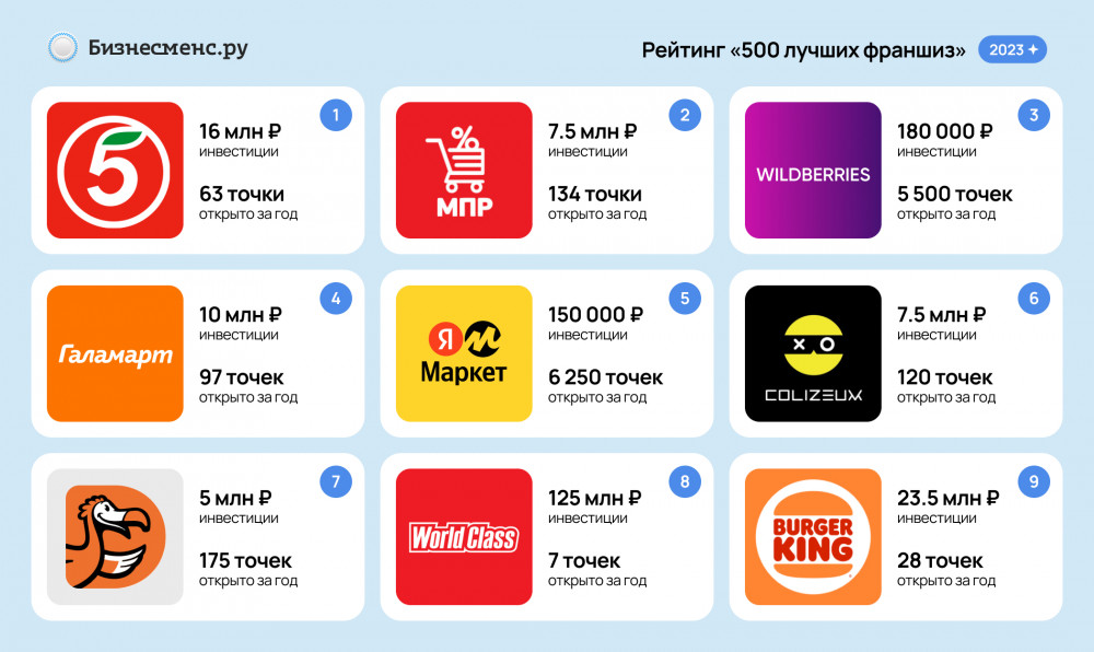 В первой пятёрке оказалась франшиза постаматов и пунктов выдачи заказов от «Яндекс.Маркет». В топ-10 вошли франшизы компьютерных клубов Colizeum и лабораторной диагностики Invitro, до этого не поднимавшиеся до лидерских позиций. С десятого на седьмое место поднялась «Додо Пицца». Продолжает удивлять результатами одна из самых инвестоёмких франшиз на рынке — сеть фитнес-центров World Class, занявшая восьмое место.