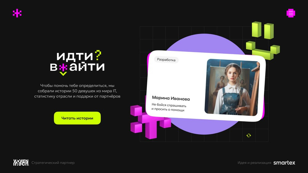 Платформа «Идти в IT?» — формат интерактивной профориентации для женщин, которые задумываются об образовании и карьере в сфере информационных технологий. На ней мы собрали истории женщин из разных высокотехнологичных компаний (ВТБ, Газпромбанк, МТС, Сибур, Сбермаркет, Тинькофф, Ясно и др.). Каждую участницу попросили рассказать о своем пути прихода в профессию, и как именно она связана с IT. Мы постарались показать многообразие профессий в IT-сфере: на площадке собраны истории не только программистов и аналитиков, но и маркетологов, продюсеров, дизайнеров и т.д. В 2023 году доля женщин в российской IT-отрасли составила 26% — есть куда расти!
