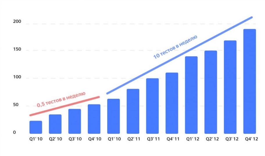 Booking проводит 25 тысяч экспериментов в год про маркетинг, интерфейс, целевую аудиторию, схемы монетизации. При этом в единовременной работе у них находится порядка 1 000 гипотез. Это позволяет максимально быстро находить рабочие гипотезы, которые увеличивают конверсию, приток денег в компанию и позволяют быстро расти. А Airbnb каждую неделю тестирует порядка 700 гипотез.