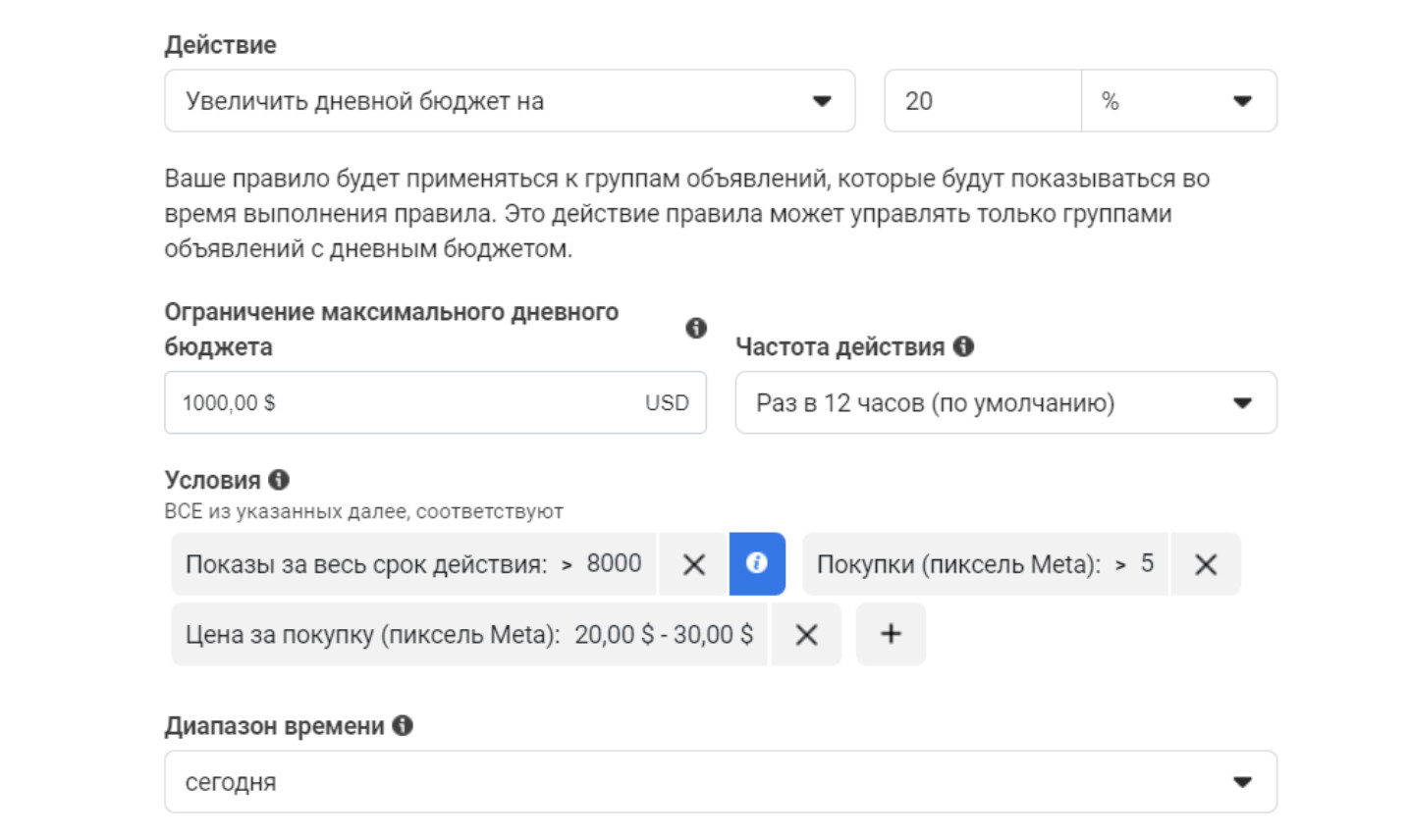 Допустим, ваша максимальная CPA, которую вы можете позволить себе потратить, составляет $33,33. Мы можем приостановить набор объявлений, если он потратил такую сумму, но не привел к продаже. Однако лучше дать набору объявлений немного передохнуть и позволить ему потратить до 1,5-кратного максимального CPA (в данном случае $50). Вот как будет выглядеть это автоправило: Вы можете взять эту же формулу и использовать ее для других показателей, например, когда CPC слишком высок или AddToCart слишком дорог. Это может быть более ранним индикатором низкой эффективности. Вот похожее правило, которое приостанавливает наборы объявлений, которые потратили хорошую сумму денег и совершили хотя бы одну покупку, но стоимость одной покупки стала слишком высокой. Выключить набор объявлений, если: Вы можете комбинировать условия с автоматическими правилами Facebook* только с помощью оператора «и». Другими словами, вы не можете запустить правило при выполнении одного или нескольких условий (оператор «или») — все они должны быть истинными. Например, если вы создаете приложение с ежемесячными и ежегодными подписками, ROAS — это именно та метрика, которую необходимо отслеживать. Возврат на потраченную рекламу (ROAS) = Доход от покупки / Затраты. Прежде чем использовать этот показатель в автоправилах, нужно определить самый низкий ROAS, который вы готовы принять. Если его нет, то по общему правилу, ROAS должен быть не менее 3,0, если целевой ROAS неизвестен. В этом случае можно создать такое правило: Выключить набор объявлений, если: Это означает, что данный набор объявлений будет приостановлен, если будет потрачено более $60, а зарегистрированный доход от покупки составит менее $180 ($60×3). Время, необходимое клиенту для конверсии, варьируется — часто набор объявлений может иметь ноль покупок, вы приостанавливаете его, а затем несколько человек конвертируются в последующие дни. Вы можете использовать автоправила для перезапуска наборов объявлений, которые были преждевременно приостановлены вручную или с помощью одного из других автоправил. Включить набор объявлений, если: Это автоправило ищет выключенные наборы объявлений с хотя бы одной покупкой с общей стоимостью покупки менее 50 долларов за последние 12 часов. Часто, если набор объявлений был приостановлен дольше этого времени, он теряет некоторые данные оптимизации и может больше не работать хорошо. В этом случае запустите набор объявлений заново как новый набор объявлений. Вот еще один пример, почему порой нужно отменить приостановку набора объявлений. Например, правило проверяет ежедневные метрики и приостанавливает набор объявлений, если Cost per Result слишком высок. Но Facebook* известен нестабильностью, и даже у исключительного объявления может быть неудачный день. Поэтому вы можете запустить его на следующий день, если его показатели за последние 7 дней были хорошими. Это правило снимет с паузы те наборы объявлений, которые выключены прямо сейчас, были приостановлены вчера, но показали хорошие результаты за последние 7 дней. Включить набор объявлений, если: Важно: если вы используете правила включения и выключения, убедитесь, что они не противоречат друг другу. Нужно не только приостанавливать убыточные кампании, но и вкладывать больше в наиболее эффективные. Условия похожи на правила паузы, но действуют наоборот. Это автома