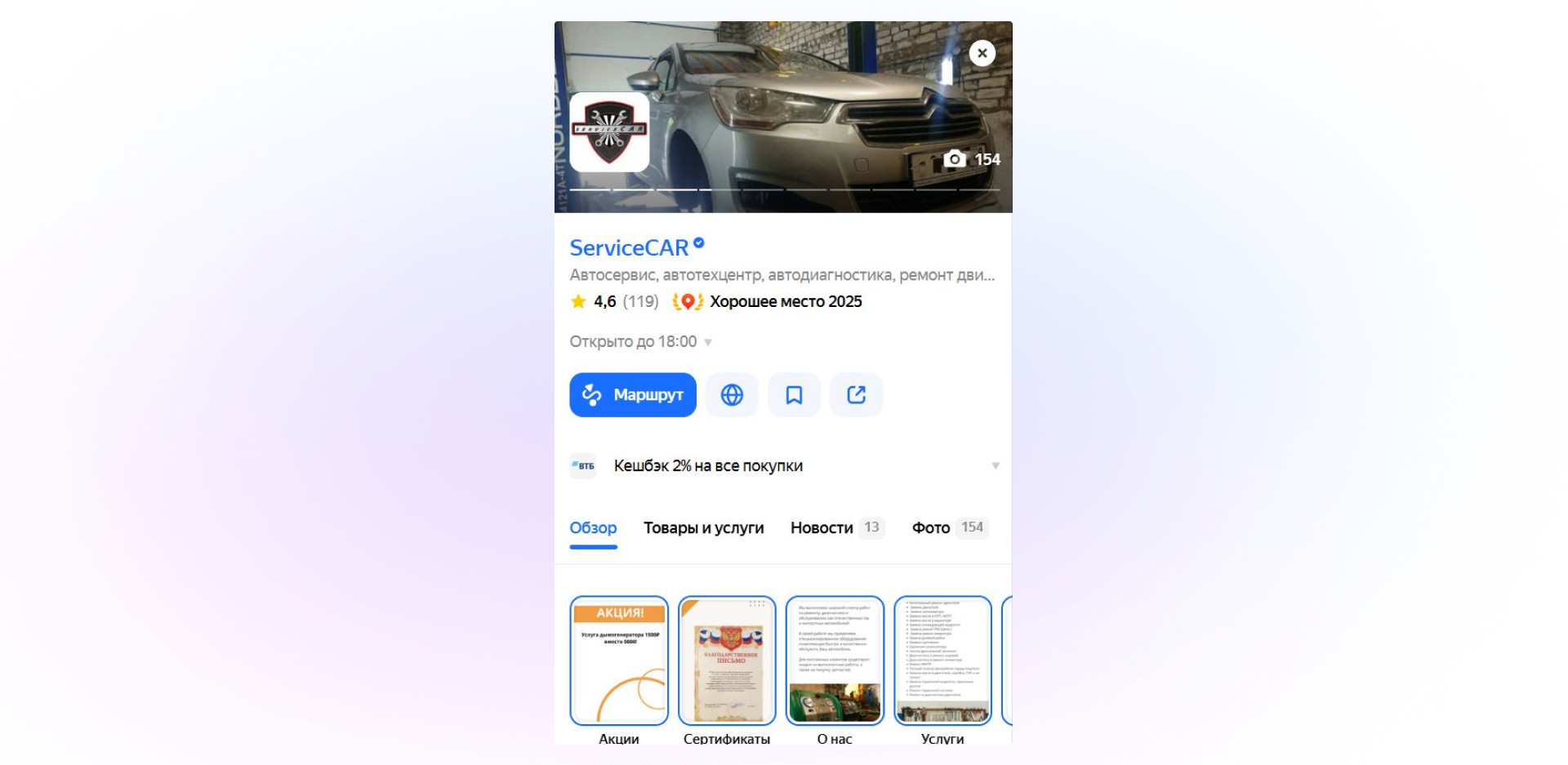 Лайфхак № 2. Приведите контент в порядок до старта рекламы Яндекс подтягивает данные о компании не только из карточки, но также с сайта и других доступных источников. Поэтому перед запуском рекламы, проверьте всю информацию о вашем сервисе в интернете. Если где-то есть фото сломанных автомобилей или грязных слесарей — удалите их, так как они могут попасть в рекламу и испортить впечатление. Лайфхак № 3. Собирайте статистику от клиентов Самый простой способ: попросите администратора или мастера приемщика задавать каждому клиенту один вопрос — «Откуда вы о нас узнали?». Собирайте такие ответы хотя бы за 1–3 месяца и вы увидите, сколько клиентов привели: Яндекс.Карты, реклама, «сарафанка», сайт или соцсети. Цифры будут не всегда точными — кто-то забудет, кто-то ответит в общем. Но даже приблизительная статистика лучше, чем отсутствие данных. Она покажет реальную конверсию и позволит посчитать стоимость привлечения клиента. И уже на основе этой информации можно решать: стоит ли повышать бюджет на рекламу или оставить все как есть. Лайфхак № 4. Проверяйте, как выглядит ваша реклама Иногда система подтягивает данные не из вашей карточки, а «придумывает» описание или услуги на основе похожих запросов. В итоге клиент может увидеть цену или услугу, которой у вас нет. Чтобы не путать клиентов, регулярно проверяйте тексты объявлений и корректируйте их. Это простое действие сэкономит вам нервы и убережет от недовольных звонков. Лайфхак № 5. Яндекс.Карты любят системность Актуальная информация и цены, ответы на отзывы, свежие публикации в разделе «Новости» — часто на это просто нет времени: клиенты, ремонт и организационные задачи гораздо важнее. А без регулярного обновления профиль теряет позиции и доверие. Мы можем взять эту работу на себя: от настройки и оптимизации карточек до системной работы с отзывами и репутацией. Заполните заявку по ссылке и получите полный анализ репутации вашего автосервиса, а также консультацию нашего ведущего эксперта бесплатно.