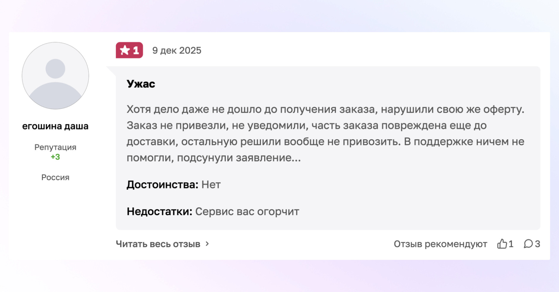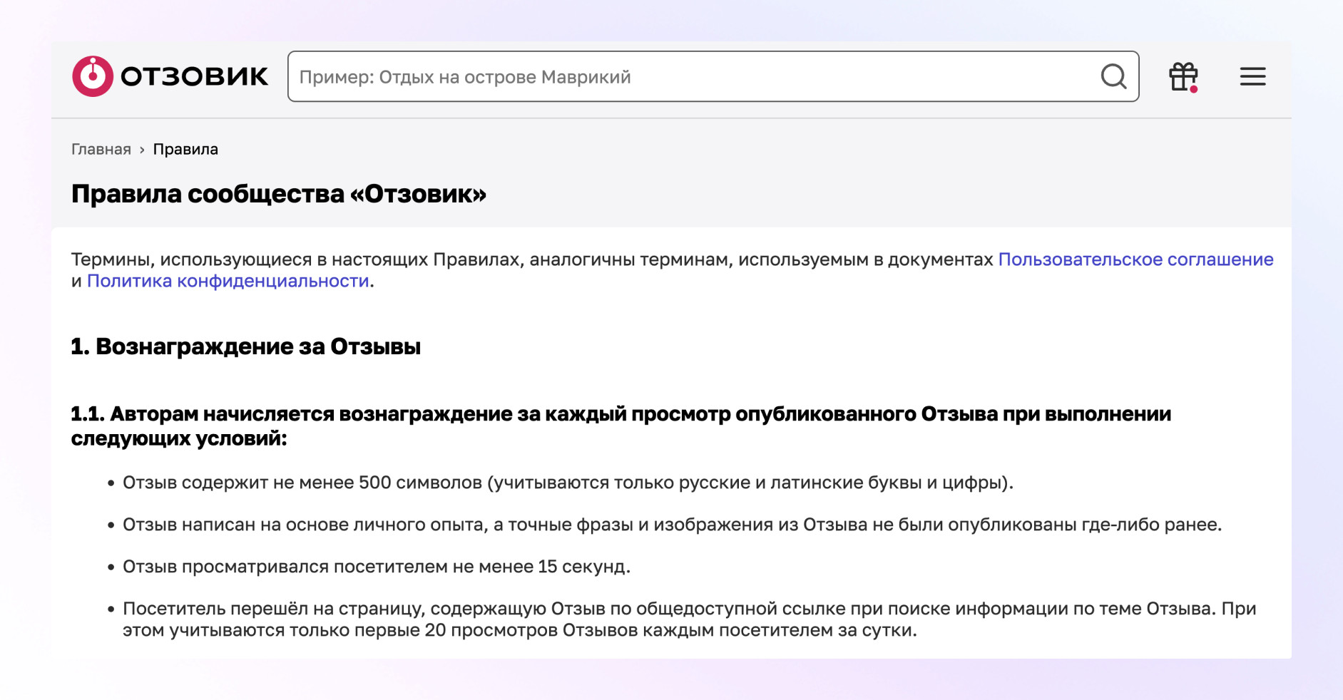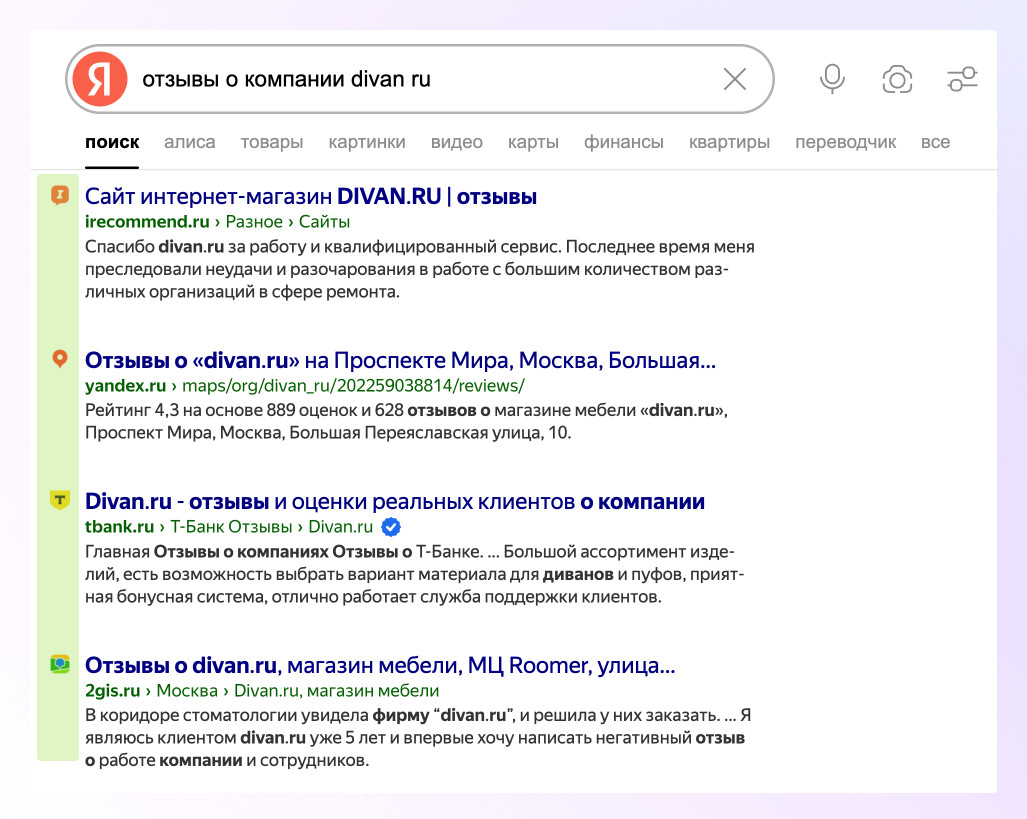При этом негативные отзывы публикуются без каких-либо сложностей. Они проходят модерацию без чеков, без фотографий и без подтверждения факта обращения в компанию. Это можно легко проверить, посмотрев карточки более-менее известных компаний на Отзовике. С учетом того, что люди охотнее делятся негативным опытом, такой подход приводит к бесконтрольному потоку негатива. Компании получают низкий рейтинг, постоянное давление со стороны отрицательных отзывов и, как результат, серьезную репутационную проблему. При этом важно понимать, что сам сервис напрямую способствует тому, чтобы на площадке было больше негатива. Важно понимать, что перекос в сторону негатива на Отзовике — это не случайность. У площадки есть прямая мотивация стимулировать именно отрицательные отзывы. Каждый пользователь, оставляющий отзыв на Отзовике, получает за это оплату. Размер выплаты зависит от объема текста и количества приложенных фотографий и может составлять несколько рублей. При этом за негативные отзывы, как правило, начисляется немного больше, чем за положительные. Дополнительно негативные отзывы помогают пользователю быстрее повышать рейтинг своего аккаунта. А при росте рейтинга любой пользователь может в перспективе стать модератором площадки. Чтобы получить статус модератора, необходимо пройти обучение и тестирование, после чего кандидат отправляется на рассмотрение администрации. В случае одобрения пользователь получает доступ к модерации контента. При этом каких-либо четких и единых правил модерации фактически не существует. Даже несмотря на наличие формальных правил на сайте, на практике им часто не следуют. В результате Отзовику выгодно, чтобы у компаний был низкий рейтинг. Чем больше негатива, тем выше интерес к площадке. Это напрямую связано с тем, что Отзовик стабильно ранжируется в топ-1, топ-3 или топ-5 по брендовым запросам. Наличие негатива в выдаче отпугивает потенциальных клиентов и усиливает влияние площадки на выбор пользователей. Механика воздействия Отзовика на бизнес становится особенно заметной в поисковой выдаче. Площадка стабильно занимает высокие позиции по коммерческим и брендовым запросам, и пользователи в первую очередь сталкиваются именно с ней. Типовая ситуация выглядит так. Пользователь ищет товар или услугу, например, «купить диван в Москве». В поисковой выдаче одной из первых появляется карточка компании на Отзовике. Человек переходит на нее и вместо внятного описания взаимодействия с компанией видит в основном негативные отзывы. «Не привезли», «привезли рваный», «обманули» — подобные формулировки формируют у потенциального клиента ощущение риска. В итоге человек задается вопросом, зачем ему вообще связываться с этой компанией, и просто исключает ее из рассмотрения. В результате бизнес несет прямые финансовые потери. Это живые деньги, которые компания теряет из-за негативного фона в поисковой выдаче. Даже если на карточке присутствуют положительные отзывы, их объем, как правило, настолько незначителен, что он никак не влияет на выбор клиента и не компенсирует общий негатив. На практике компании редко понимают масштаб этих потерь. Неочевидно, сколько клиентов уходит уже на этапе поисковой выдачи, какие именно отзывы и площадки сильнее всего влияют на решение и как в целом выглядит компания в гла