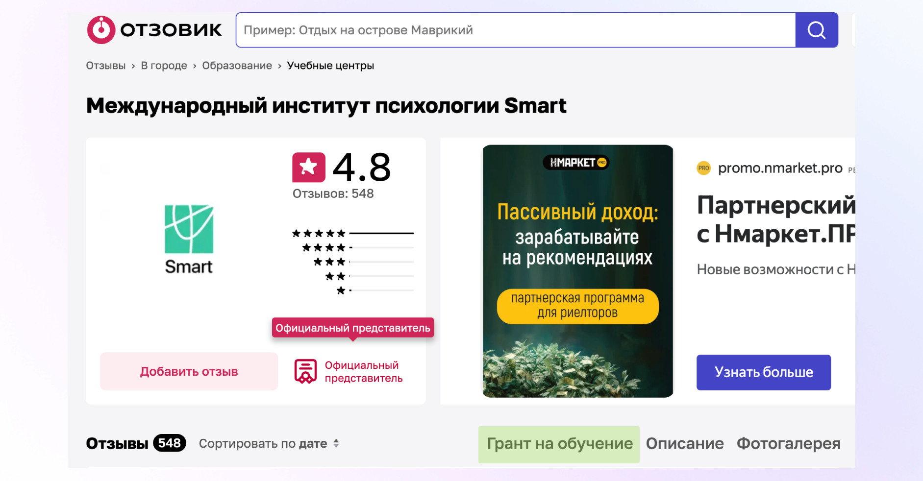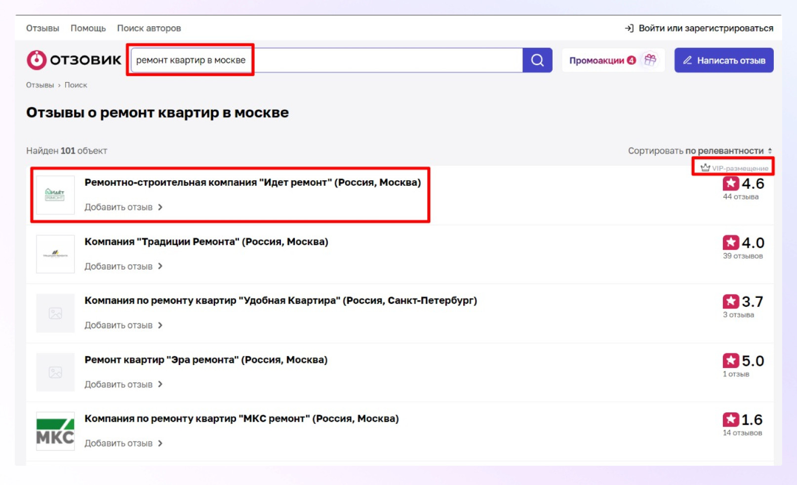Первое место в поиске Отзовика