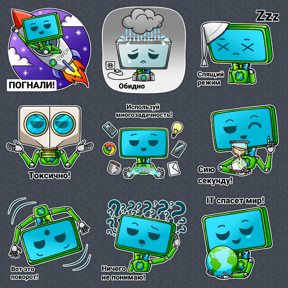 Чтобы Мониторчик появился в ваших стикерах Telegram, пройдите по ссылке https://t.me/addstickers/QWEPmonitor и нажмите кнопку «Добавить 10 стикеров»