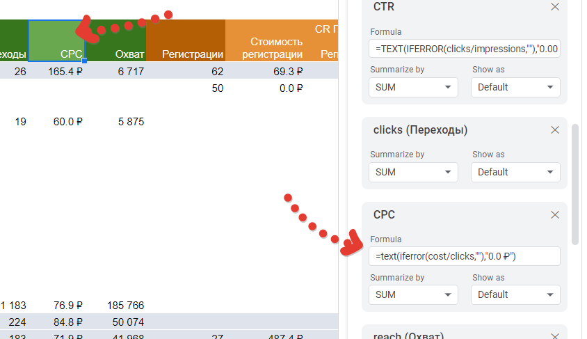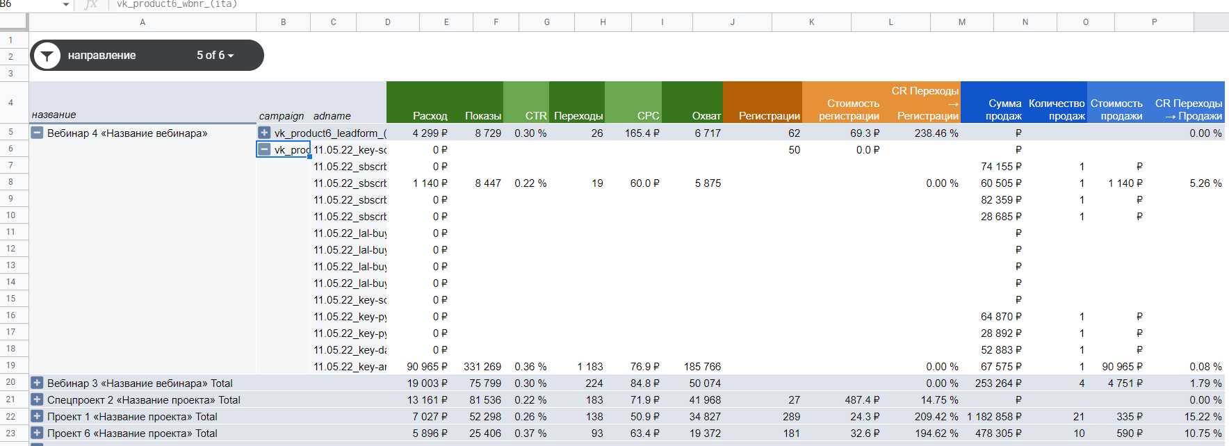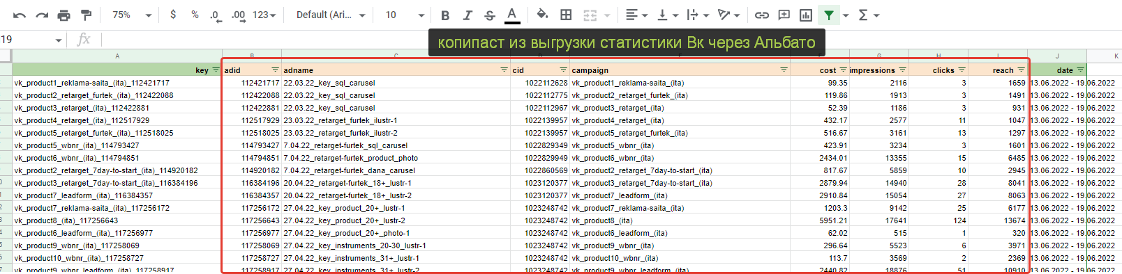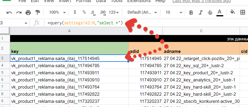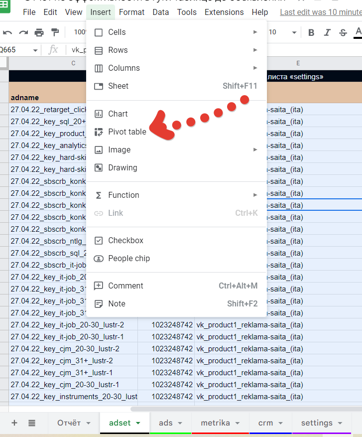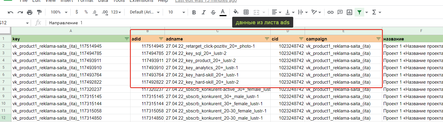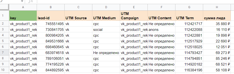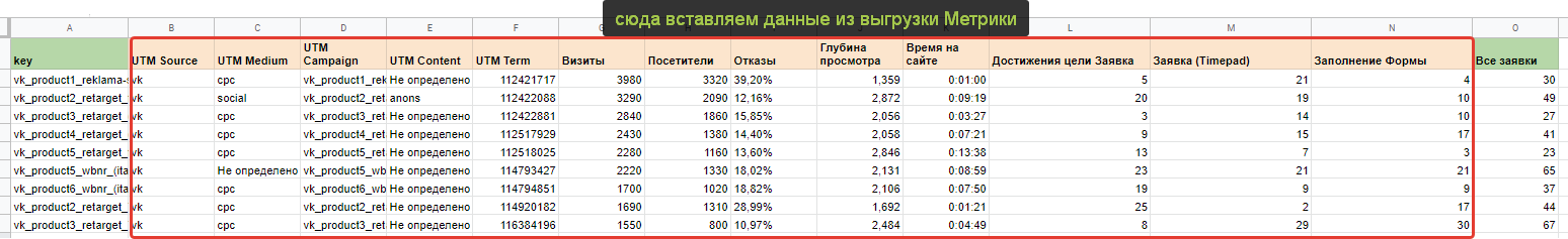 Вероятнее всего, руководитель захочет видеть какие-то промежуточные цели из веб-аналитики. Соответственно это Яндекс Метрика. Привёл их на скриншоте выше. Скриншот важен, т.к. мы постепенно соберём всю архитектуру нашего отчёт в одной картинке. Про архитектуру аналитического решения можно почитать тут. Далее мы будем объединять данные и в конечном итоге получим такую структуру. Мы определились с источниками и теперь нам необходимо вытащить оттуда данные для отчёта. Но предварительно создадим Гугл Таблицу с листами под каждый из источников. Итак, у нас есть лист под данные из Вк. Осталось их достать. Тут я рекомендую использовать сервис Альбато и промежуточную Гугл Таблицу. Без Альбато выгрузка не получится, т.к. только с ней или иным образом по API можно вытащить нужный массив данных с ad-id, ad-name, campaign-id, campaign-name. Я не стал включать в текущую статью инструкцию, как это сделать, т.к. текста было бы очень много. Вместо этого я описал процесс связки статистики Вк и Гугл таблиц в отдельной статье. Итоговая выгрузка статистики из Вконтакте с объявлениями и кампаниями в одном наборе будет выглядеть следующим образом. Единственный момент (очень важно!) выгрузку из Альбато нужно перевести в сводную, чтобы вывести уникальные значения объявлений и только потом копировать. Ссылку на этот лист в Гугл Таблице я сразу привожу тут. Так вам будет проще разобраться. Кстати, Альбато не панацея, если вы не хотите использовать его, то аналогичную конструкцию можно собрать более длинным путём, сначала выгрузив из статистики рекламы Вконтакте данные по объявлениям и потом обогатив их названиями кампаний и id кампаний в дополнительных столбцах. На листе вы можете заметить дополнительные столбцы зелёного цвета. На «date» можете не обращать внимания, это я тестировал свои варианты. А вот «key» критически важен, там формула склеивает название кампании с id объявления — это критически важно, т.к. с помощью ключа в дальнейшем мы склеим разные источники данных. Таким образом, данные по рекламе Вконтакте у нас готовы. Теперь достаём данные из Метрики. Для этого идём в отчёт «метки UTM», добавляем нужные цели для анализа и выгружаем всё в табличку Excel. Открываем Ексель и переносим данные оттуда на подготовленный лист в Гугле. Он тут. В данном примере у нас три KPI цели: регистрации на вебинар, отправки форм, регистрации Timepad. Для них добавляем зелёный столбце где суммируем все KPI значения для удобства. Также создаём ключ «key» аналогично Вконтакте. На этом данные из Метрики готовы. Чтобы выгрузить данные из CRM и они подошли в нашу отчётность, лиды в ней должны содержать utm-метки с рекламы. Если таковых нет, то построить отчёт по таргетированной рекламе до продаж не получится и придётся довольствоваться только Метрикой. Итак выгружаем Excel или csv файл из вашей CRM, который будет содержать следующие поля. Лист с выгрузкой тут. Аналогичным образом прошлым шагам добавляем уникальный ключ key. Всё готово. Чтобы объединить данные, нам нужна будет справочная таблица. Её формируем на этом листе, вставляя туда данные из листа «ads». Это основная таблица нашего отчёта. Во-первых добавляем для неё параметр key. Во-вторых вытаскиваем множество значений из названия объявлений и кампании, они тоже выделены зелёным и содержат: название запуска; направление подразделения бизнеса; формат визуала. Факти