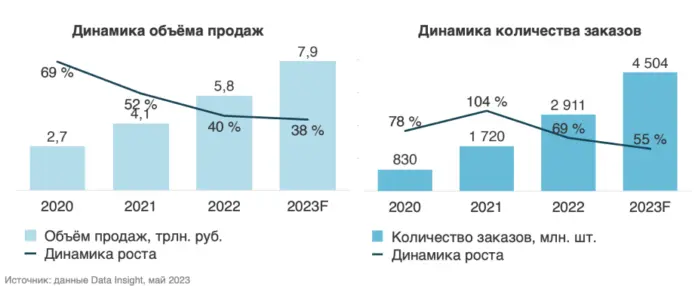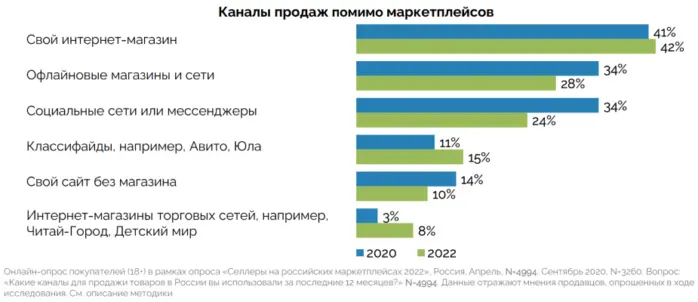 По данным Data Insight за май 2023, объем продаж и количество онлайн заказов с каждым годом продолжает увеличиваться. Доля заказов на маркетплейсах Wildberries и Ozon от всех онлайн-заказов также продолжает расти: Сегодня потребители все больше отдают предпочтение онлайн-каналам покупки. Вместе с этим количество используемых каналов продолжает увеличивается. И к уже известным нам интернет-магазинам и маркетплейсам добавляются соцсети, мессенджеры и сайты объявлений. Это не может не влиять на поведение продавцов. Так, доля продавцов, которые наряду с маркетплейсами для продаж используют собственные офлайн-магазины и социальные сети уменьшается. А вот количество продавцов, прибегающих к использованию классифайдов и омниканальных магазинов, увеличивается: Несмотря на удобство использования и возможности, которые предоставляют маркетплейсы, есть определенные проблемы, которые делают использование маркетплейса не таким привлекательным. По результатам исследования Тинькофф основными проблемами продавцов на маркетплейсах являются: К перечисленным выше проблемам можно добавить еще несколько: Но несмотря на все это, маркетплейсы остаются отличной площадкой, выбор в сторону которой часто делают небольшие бизнесы и начинающие предприниматели, которые только пробуют себя в ecom сфере или точно уверены, что сайт им сейчас не нужен. По мере развития профиля компании на маркетплейсе может возникнуть потребность в масштабировании и расширении. Давайте рассмотрим основные «звоночки», по которым можно понять, что маркетплейса для вашего бизнеса будет недостаточно. Каким бы классным не был маркетплейс, не в каждой ситуации он будет действительно эффективным и выгодным решением. Ниже примеры ситуаций, в которых лучше отдать предпочтение интернет-магазину: Важно помнить, что создание и поддержание собственного интернет-магазина требует инвестиций в разработку, маркетинг и обслуживание, поэтому прежде чем принять окончательное решение необходимо взвесить все «за» и «против», чтобы учесть все аспекты бизнес-стратегии. Не уверены в том, нужен ли вам интернет-магазин? Мы будем рады обсудить детали и предложить варианты конкретно под вашу ситуацию. Просто напишите нам.