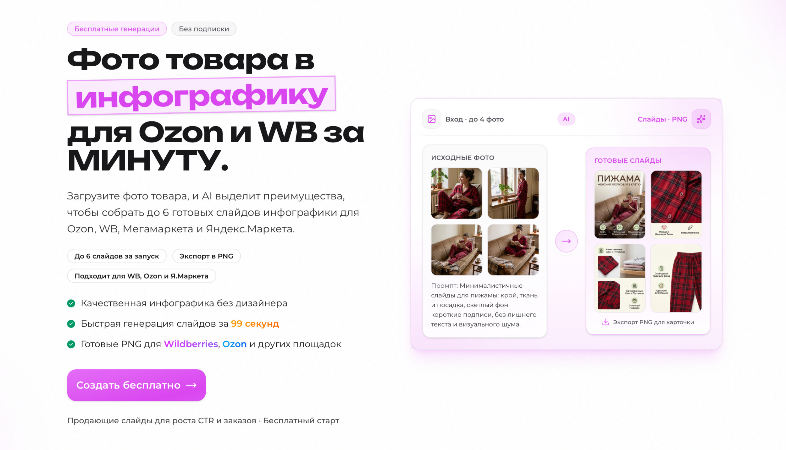 Ключевое ценностное предложение: загрузите фото товара и через 60 секунд получите набор из 6 готовых PNG-слайдов с выделенными преимуществами.