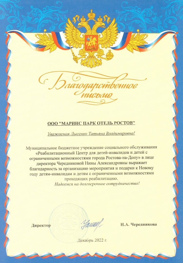 — С огромным удовольствием поздравили деток из реабилитационного центра с Новым годом, — говорит Татьяна Владимировна Лысенко, генеральный директор конгресс-отеля «Маринс Парк Отель Ростов». — Когда я предложила нашим сотрудникам принять участие в акции «Ёлка желаний» и исполнить ту или иную мечту детей, я была безмерно рада, что мы смогли исполнить все желания с этой «ёлки»! Мы приехали к ребятам с Дедом Морозом и Снегурочкой, придумали и разыграли небольшую сценку, вручили ребятам подарки, именно те, о которых они мечтали: кто-то хотел робота, кто-то суперконструктор. Мероприятие прошло великолепно, но самая большая радость — увидеть счастливые глаза детей. Пусть мы познакомились с ребятами из центра не очень давно, но очень подружились за это время и гордимся нашей дружбой! Директор реабилитационного центра Нина Александровна Чередникова поблагодарила сотрудников и руководителей «Маринс Парк Отель Ростов» за организацию мероприятия и подарки к Новому году для ребят, вручив генеральному директору отеля Татьяне Владимировне Лысенко благодарственное письмо. Ребята также активно участвовали в празднике — каждый из них подарил в ответ гостям поделку, сделанную своими руками. Кинокомпания «Союз Маринс Групп», в состав предприятий которой входит конгресс-отель «Маринс Парк Отель Ростов», особое внимание уделяет детским домам и реабилитационным центрам, помогая и даря радость детям и подросткам, которые в этом особенно нуждаются. Коллектив отеля убеждён, что такие встречи и праздники просто необходимы как ребятам, так и самим взрослым, ведь дружеское общение заряжает положительными эмоциями и энергией на долгое время, а добро всегда возвращается сторицей. Следите за новостями кинокомпании «Союз Маринс Групп» в социальных сетях: #маринсгрупп #маринспаркотель #маринспаркотельростов #союзмаринсгрупп #ёлкажеланий #ёлкажеланийростов #конгрессотельростов