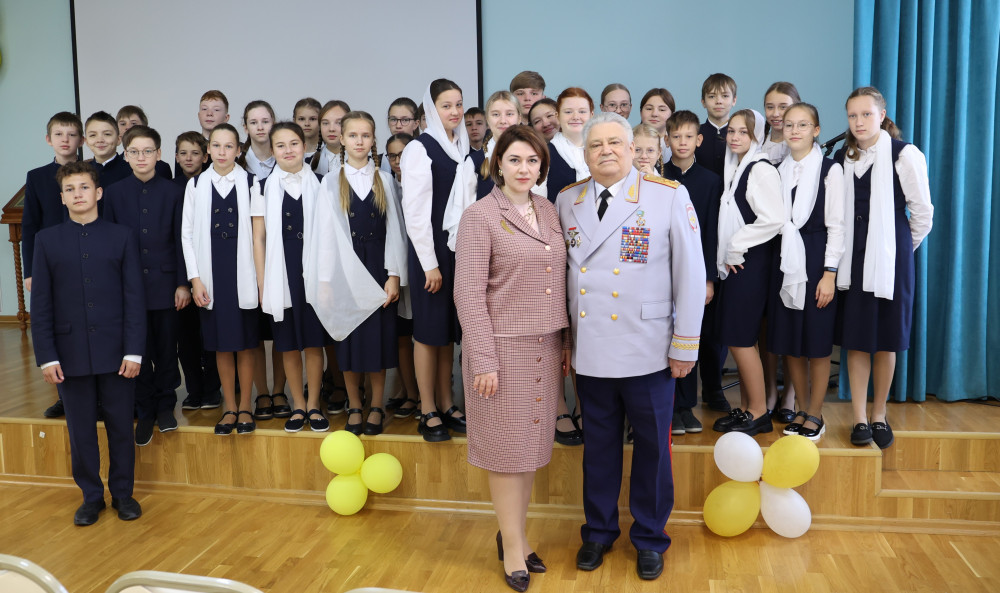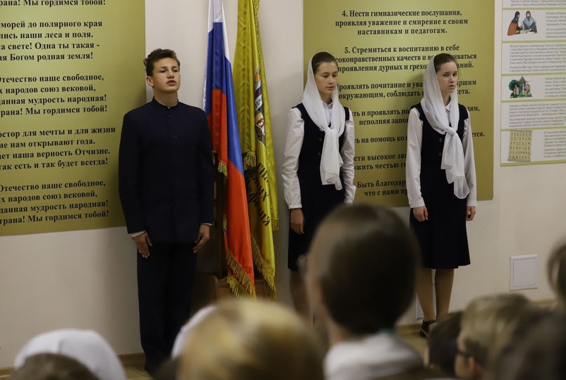 По традиции утро понедельника 9 октября началось для гимназистов, преподавателей и гостей учебного заведения с общей молитвы в храме в честь святых апостола Тимофея и мученицы Татианы, которую провёл её настоятель протоиерей Дмитрий Дылдин. Общее для всех построение на линейке с торжественным выносом флага Российской Федерации и исполнением гимна страны завершилось обращением директора Ирины Александровной Лапшиной, которая поздравила всех ребят с началом новой учебной недели и представила почётного гостя — Вячеслава Ивановича Каныгина, который 40 лет проработал в органах внутренних дел, занимал пост министра внутренних дел на Северном Кавказе, прошёл горячие точки.