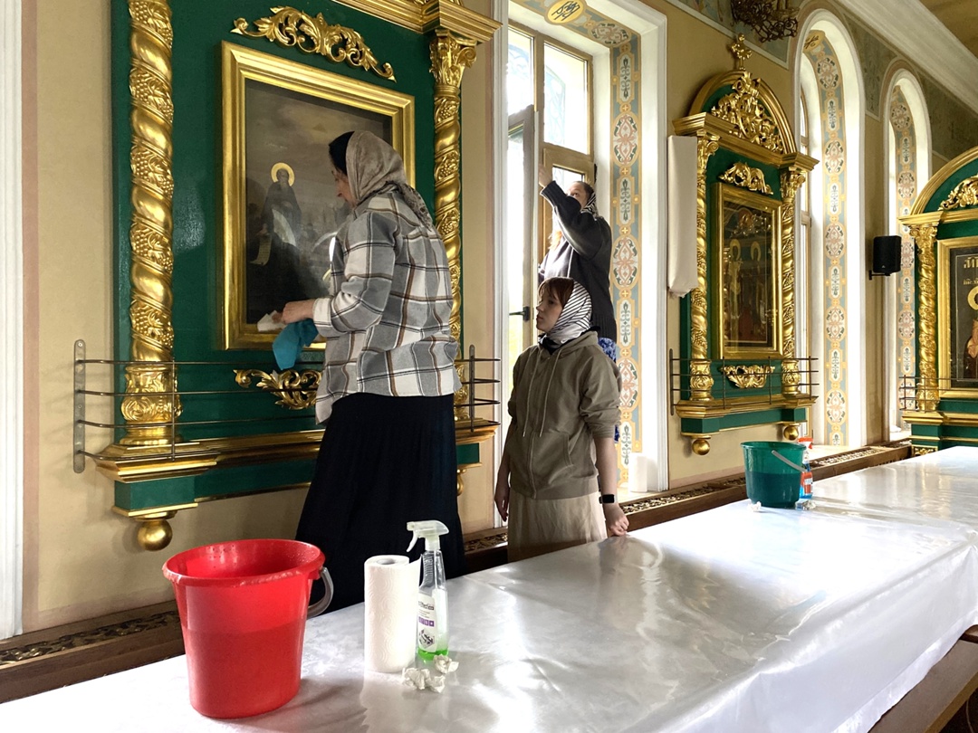 Фронт работы внушительный: помыть окна и стены во Всехсвятском и Знаменском храмах, очистить от налёта копоти киоты, иконы, очистить полы, помочь братии на прилегающей территории.