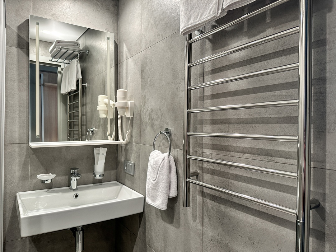 В ходе реализации проекта было осуществлено полное переустройство строительных конструкций и инженерных коммуникаций, включая предварительный демонтаж всех перегородок, возведённых еще при строительстве отеля в 1960-х годах, и очистку этажа до состояния бетонного каркаса. Особое внимание уделено шумоизоляции: новые межкомнатные стены выполнены на независимом металлическом каркасе в два слоя для обеспечения практически полного звукоизоляционного разделения между номерами. Усиленные конструкции дверных проёмов также повысили эксплуатационную надёжность. Полностью обновлены инженерные сети: системы водоснабжения, отопления, вентиляции, электроснабжения и канализации. Дополнительно внедрена новая система электронного доступа в номера с управлением через Wi-Fi. Изменения коснулись и планировочных решений: увеличилось количество номеров с двуспальными кроватями за счёт применения системы спринг-боксов — современного гостиничного стандарта, при котором два отдельных спальных модуля могут использоваться как единая двуспальная кровать. Кроме того, впервые был применён новый дизайн-код сети отелей Marins Hotels, разработанный департаментом графического и медиадизайна компании «Союз Маринс Групп». — Особое внимание было уделено оформлению номеров и приёмам, которые повышают эргономику помещения, — подчеркнул директор по архитектуре, дизайну и эстетике «Союза Маринс Групп» Андрей Сергеевич Константинов. — Наш предыдущий корпоративный фирменный стиль с пурпурным ковролином, использовавшийся более десяти лет, достаточно узнаваем, интересен, но время идёт. В новом дизайн-коде мы решили сделать фон более нейтральным и переместить акцентные цвета в мебель ‒ кресла, прикроватные столики, цветные картины. Интерьеры комнат выполнены в современном минималистичном стиле с акцентом на функциональность и комфорт. Дизайн сдержанный, минималистичный, отчасти модернистский, с отсылом к 60-70-м годам, когда и было построено здание отеля, когда все дизайн-решения были достаточно простыми и подчёркивали лёгкость и демократичность пространства. Для отделки использованы декоративные панели с текстурой дерева, многослойная шпаклёвка и краска. Радиаторы и кондиционеры аккуратно вписаны в интерьер. Современные решения были применены в санузлах. Душевые зоны выстроены с использованием керамогранита крупного формата, без возведения порогов, что делает их максимально удобными и безопасными. В отделке преобладают нейтральные оттенки серого с белыми и хромированными элементами. В ходе торжественной части мероприятии, которая прошла в конференц-зале «Маринс Парк Отель Екатеринбург», были отмечены сотрудники, внесшие большой вклад в реализацию проекта. ‒ Обновление интерьеров и улучшение условий — это возможность создать атмосферу уюта и комфорта, где каждый гость может почувствовать себя как дома, ‒ отметила Анастасия Алексеевна Тунина, генеральный директор «Маринс Парк Отель Екатеринбург». ‒ Мы стремились сохранить уникальный стиль нашей гостиницы, добавив современные элементы, которые отвечают самым высоким стандартам. Но это подарок не только для наших гостей, но и для всей команды отеля. После завершения всех ремонтных работ пятый этаж стал высококлассным, комфортным и стильным пространством, которое идеально соответству