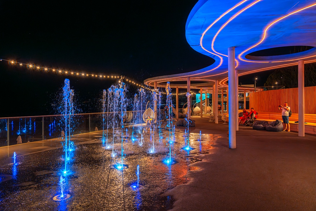 Завершающим этапом реновации пляжа «Изумрудный» стало благоустройство четвёртого сектора с современной зоной для семейного отдыха. На нём расположились открытые многоуровневые террасы, выполненные из натуральной лиственницы, оригинальные декоративные элементы, специальное покрытие способствует безопасности детей, а необычный по своей конфигурации футуристичный навес в дневное время дает возможность гостям укрыться от солнца или дождя, вечером же благодаря современному неоновому освещению превращается в оригинальный арт-объект.