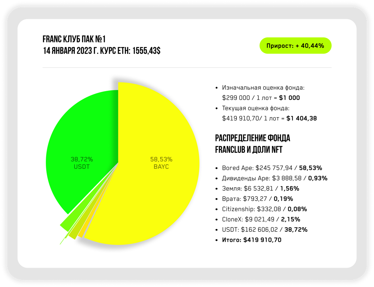 Кстати говоря, FRANC — это тоже аббревиатура, как и BAYC: FRANC расшифровывается так: F — Fractional R — Regolith A — Ape N — NFT C — Club Каждый член клуба является его инвестором, и владеет пропорциональной долей NFT-активов клуба. Каждому инвестору выплачиваются проценты с прибыли NFT-фонда FRANC, который был создан изначально как центр объединения участников в формате дробных инвестиций. За 2022 год NFT фонд FRANC принес своим инвесторам более 30% или в денежном выражении более 90 000$ доходности. Все NFT-активы клуба были поделены на 299 частей для того, чтобы за каждым членом клуба закрепить определенное количество лотов, тем самым определить его процентную долю в клубе. Относительно данной процентной доли инвестор будет иметь возможность проинвестировать в предлагаемые FRANClub проекты, например, ресторан в Дубае. Это BAYC (Bored Ape Yacht Club) #4217 — наш главный клубный символ — очень редкий APE с отличительным глазом CYBORG. Всего в коллекции BAYC — 10 000 изображений NFT обезьян, но с таким кибер-глазом всего 108 шт. В свободной продаже из 108 штук с кибер-глазом продается всего 3 и средняя стоимость за такого красавца равняется 275 ETH или 365 000$ (по состоянию на 10.01.2023) В самом начале в марте 2022 мы решили купить обезьяну, и охотились именно за обезьяной с кибер-глазом или с кибер-кожей. Нам нравится все, что связано с кибернетикой и нам нужна была обезьяна полуробот. Подходящие стоили минимум 250 000$ и в какой-то момент, в апреле, пошел бурный рост цены коллекции BAYC, цены выросли до 350 000 — 500 000$. Мы не укладывались в цену и было принято решение, что максимальная цена, за которую мы будем готовы купить — 299 000$. Потом рынок начал корректироваться и наши аналитики увидели, что ETH может коснуться отметки в 1000$. Мы стали выжидать подходящее время для покупки, и звезды сошлись так, что нам удалось купить BAYC #4217 за 125 000$ и именно из самой крутой кибер-коллекции CYBORG. Нашему счастью не было предела! Мы поделили клуб на 299 долей (лотов, частей), где 1 лот составил 1000$, следовательно, 299 лотов равнялось изначально суммарно 299 000$, это и стало отправной точкой нашего клубного NFT-фонда — текущая оценка фонда уже более 419 000$ (по состоянию на 14.01.2023). В итоге на 299 000$ были куплены разные NFT и разделены на 299 частей. Покупка и продажа происходит командой наших аналитиков и, если судить по результатам на сегодня, покупки NFT получились очень выгодными. На настоящий момент доходность на 1 лот составляет чуть более 30%, а общая сумма фонда более 419 000$. К примеру, NFT BAYC #4217 купленная за 125 000$ — cейчас торгуется за 243 000$ и это на текущем красном рынке. Вокруг крипто-зима, а у нас +40% к инвестициям клуба — круто же! Есть и другие инвестиции в NFT, с которыми вы можете ознакомиться на OpenSea.io на официальной странице клуба. Еще мы планируем купить NFT из коллекции Crypto Punk — самая первая NFT коллекция. Сделаем это как только закроем набор в клуб! Чтобы не быть голословными, мы предлагаем вам посмотреть весь портфель клуба по ссылке https://opensea.io/FRANClub FRANClub владеет NFT-активами на $ 419 910,70. Это общая сумма средств в NFT-фонде FRANC. Средства FRANClub фонда распределены следующим образом: • Bored Ape: $245 757,94 / 58,53% • Дивиденды Ape: $3 888,58 / 0,93% • Земля: $6 532,81 / 1,56% • Врата: $793,27 / 0,19% • Citizenship: $332,08 / 0,08% • CloneX: $9 021,49 / 2,15% • USDT: $162 606,02 / 38,72% • Итого: $419 910,70 $146 000 потрачено на покупку NFT $130 000 прирост коллекций $162 000 составляет свободный остаток клуба в USDT, на который будут продолжаться закупки NFT в фонд клуба. Для 