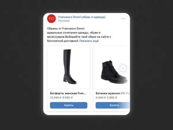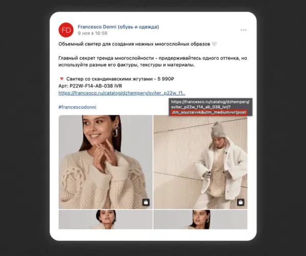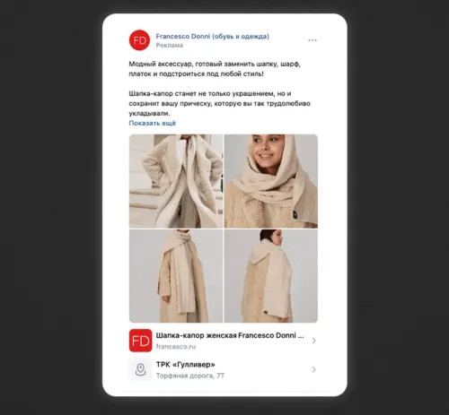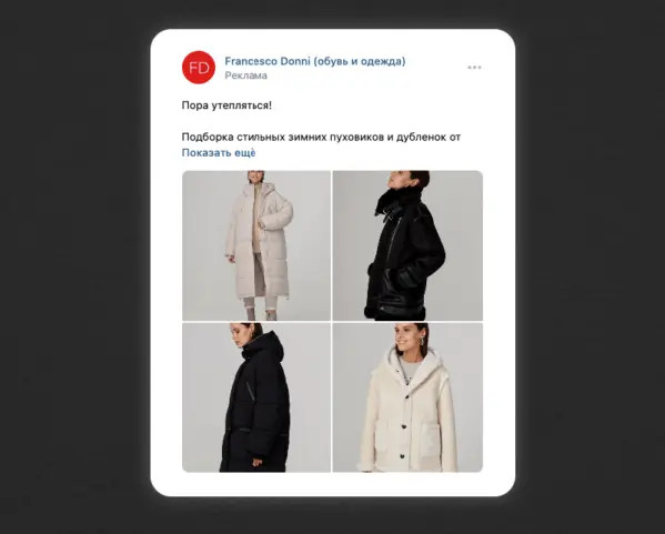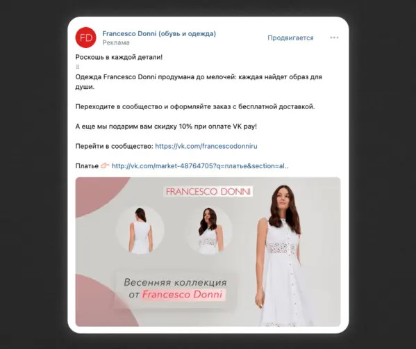 Инстаграм* ограничил возможность продвижения товаров из России, поэтому вместе с компанией Франческо Донни мы решили продавать женскую одежду во ВКонтакте.