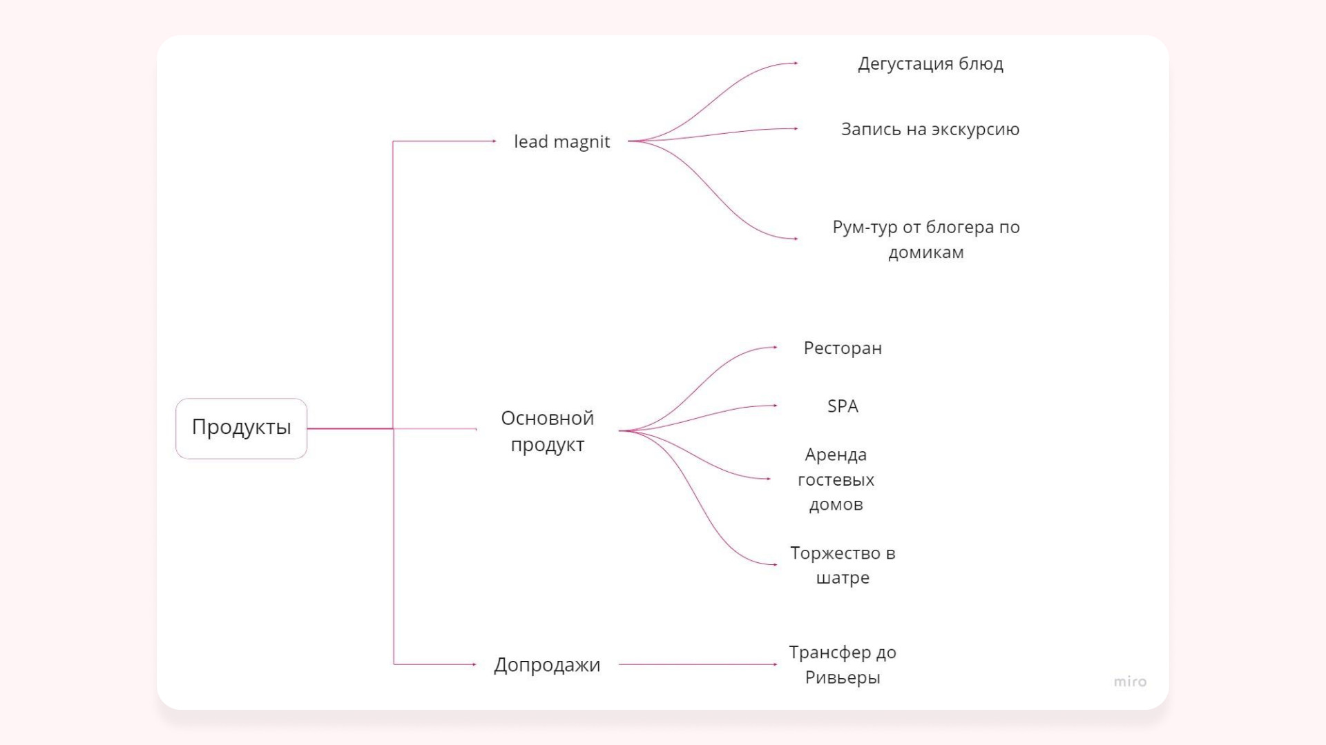 - Создали схему продуктовой линейки, где выделили основной продукт, сопутствующие товары и продукты, которые могут служить лид-магнитом для привлечения клиентов.