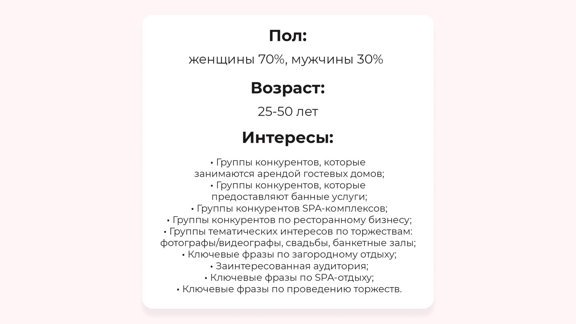 - Привели заявки с бюджетов в 64 200 ₽:— на гостевые дома: 31 по 966 ₽— на спа-услуги и баню: 29 по 629 ₽— на торжества: 11 по 960 ₽— на другие направления: 91 по 705 ₽