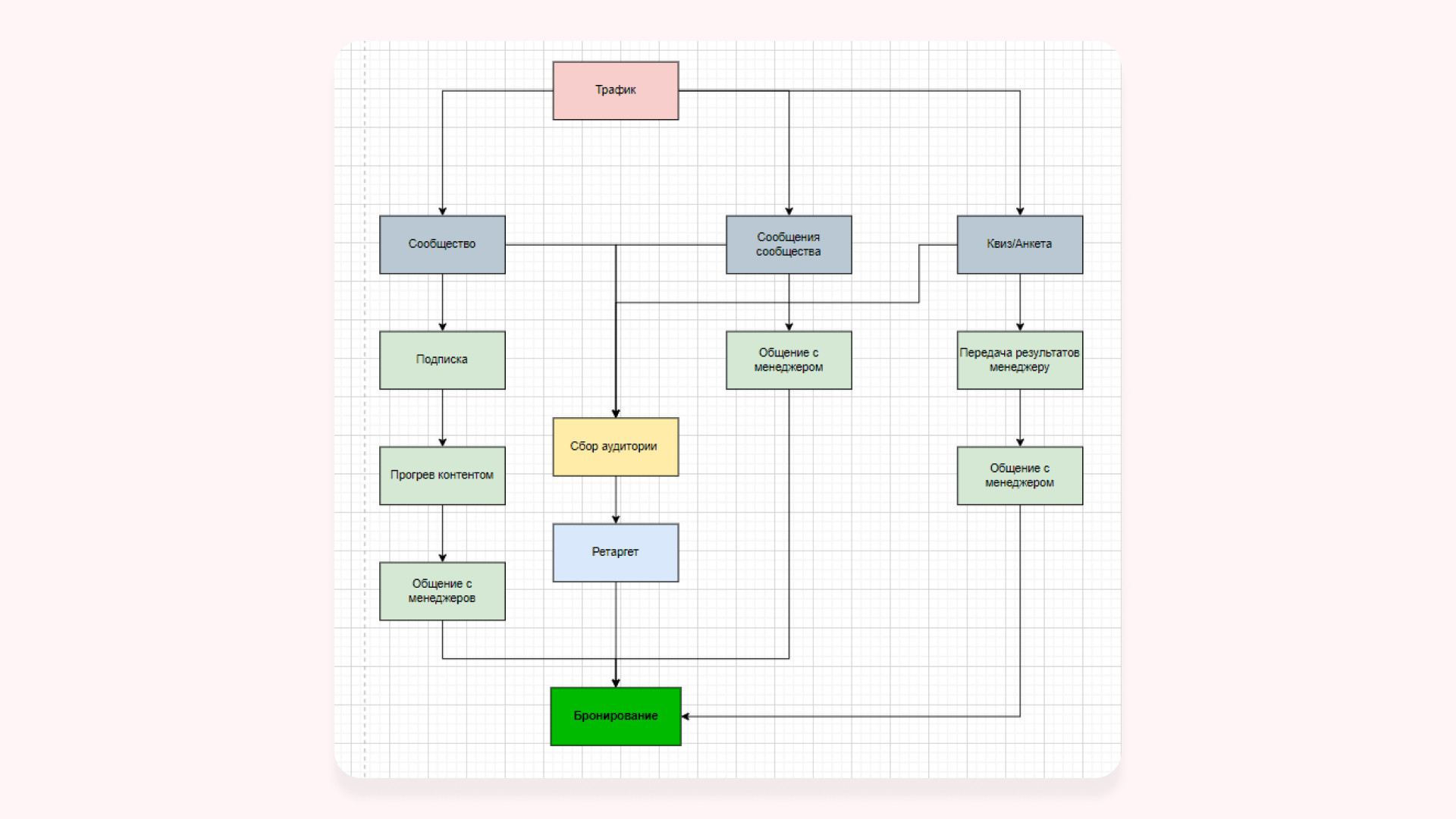 - Составили карту трафика — схему шагов клиента от первого касания до покупки. Вели аудиторию на «Сообщения сообщества» и в сообщество. В сообществе прогревали пользователей контентом и отправляли в «Сообщения сообщества», где их ожидало предложение с промокодами. Далее к работе подключался менеджер заказчика. Параллельно на каждом этапе собирали базу ретаргета. Такой подход помогал выстраивать рекламные кампании и находить эффективные связки рекламных объявлений.